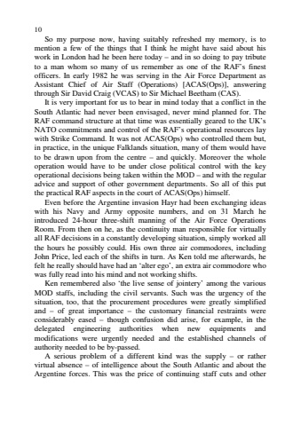 10So my purpose now, having suitably refreshed my memory, is tomention a few of the things that I think he might have said about hiswork in London had he been here today %u2013 and in so doing to pay tributeto a man whom so many of us remember as one of the RAF%u2019s finestofficers. In early 1982 he was serving in the Air Force Department asAssistant Chief of Air Staff (Operations) [ACAS(Ops)], answeringthrough Sir David Craig (VCAS) to Sir Michael Beetham (CAS).It is very important for us to bear in mind today that a conflict in theSouth Atlantic had never been envisaged, never mind planned for. TheRAF command structure at that time was essentially geared to the UK%u2019sNATO commitments and control of the RAF%u2019s operational resources laywith Strike Command. It was not ACAS(Ops) who controlled them but,in practice, in the unique Falklands situation, many of them would haveto be drawn upon from the centre %u2013 and quickly. Moreover the wholeoperation would have to be under close political control with the keyoperational decisions being taken within the MOD %u2013 and with the regularadvice and support of other government departments. So all of this putthe practical RAF aspects in the court of ACAS(Ops) himself.Even before the Argentine invasion Hayr had been exchanging ideaswith his Navy and Army opposite numbers, and on 31 March heintroduced 24-hour three-shift manning of the Air Force OperationsRoom. From then on he, as the continuity man responsible for virtuallyall RAF decisions in a constantly developing situation, simply worked allthe hours he possibly could. His own three air commodores, includingJohn Price, led each of the shifts in turn. As Ken told me afterwards, hefelt he really should have had an %u2018alter ego%u2019, an extra air commodore whowas fully read into his mind and not working shifts.Ken remembered also %u2018the live sense of jointery%u2019 among the variousMOD staffs, including the civil servants. Such was the urgency of thesituation, too, that the procurement procedures were greatly simplifiedand %u2013 of great importance %u2013 the customary financial restraints wereconsiderably eased %u2013 though confusion did arise, for example, in thedelegated engineering authorities when new equipments andmodifications were urgently needed and the established channels ofauthority needed to be by-passed.A serious problem of a different kind was the supply %u2013 or rathervirtual absence %u2013 of intelligence about the South Atlantic and about theArgentine forces. This was the price of continuing staff cuts and other