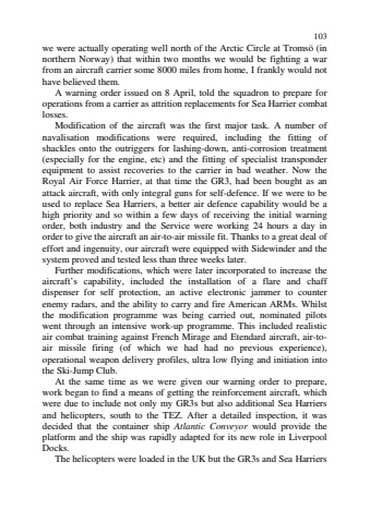 103we were actually operating well north of the Arctic Circle at Troms%u00f6 (innorthern Norway) that within two months we would be fighting a warfrom an aircraft carrier some 8000 miles from home, I frankly would nothave believed them.A warning order issued on 8 April, told the squadron to prepare foroperations from a carrier as attrition replacements for Sea Harrier combatlosses.Modification of the aircraft was the first major task. A number ofnavalisation modifications were required, including the fitting ofshackles onto the outriggers for lashing-down, anti-corrosion treatment(especially for the engine, etc) and the fitting of specialist transponderequipment to assist recoveries to the carrier in bad weather. Now theRoyal Air Force Harrier, at that time the GR3, had been bought as anattack aircraft, with only integral guns for self-defence. If we were to beused to replace Sea Harriers, a better air defence capability would be ahigh priority and so within a few days of receiving the initial warningorder, both industry and the Service were working 24 hours a day inorder to give the aircraft an air-to-air missile fit. Thanks to a great deal ofeffort and ingenuity, our aircraft were equipped with Sidewinder and thesystem proved and tested less than three weeks later.Further modifications, which were later incorporated to increase theaircraft%u2019s capability, included the installation of a flare and chaffdispenser for self protection, an active electronic jammer to counterenemy radars, and the ability to carry and fire American ARMs. Whilstthe modification programme was being carried out, nominated pilotswent through an intensive work-up programme. This included realisticair combat training against French Mirage and Etendard aircraft, air-toair missile firing (of which we had had no previous experience),operational weapon delivery profiles, ultra low flying and initiation intothe Ski-Jump Club.At the same time as we were given our warning order to prepare,work began to find a means of getting the reinforcement aircraft, whichwere due to include not only my GR3s but also additional Sea Harriersand helicopters, south to the TEZ. After a detailed inspection, it wasdecided that the container ship Atlantic Conveyor would provide theplatform and the ship was rapidly adapted for its new role in LiverpoolDocks.The helicopters were loaded in the UK but the GR3s and Sea Harriers