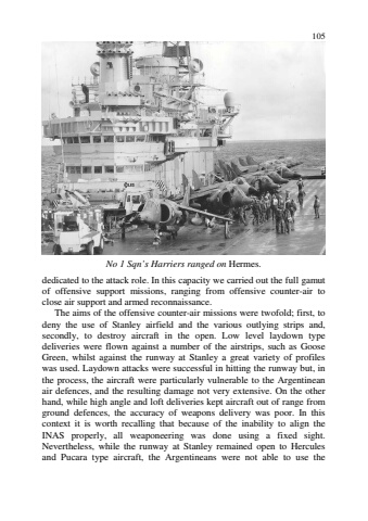 105No 1 Sqn%u2019s Harriers ranged on Hermes.dedicated to the attack role. In this capacity we carried out the full gamutof offensive support missions, ranging from offensive counter-air toclose air support and armed reconnaissance.The aims of the offensive counter-air missions were twofold; first, todeny the use of Stanley airfield and the various outlying strips and,secondly, to destroy aircraft in the open. Low level laydown typedeliveries were flown against a number of the airstrips, such as GooseGreen, whilst against the runway at Stanley a great variety of profileswas used. Laydown attacks were successful in hitting the runway but, inthe process, the aircraft were particularly vulnerable to the Argentineanair defences, and the resulting damage not very extensive. On the otherhand, while high angle and loft deliveries kept aircraft out of range fromground defences, the accuracy of weapons delivery was poor. In thiscontext it is worth recalling that because of the inability to align theINAS properly, all weaponeering was done using a fixed sight.Nevertheless, while the runway at Stanley remained open to Herculesand Pucara type aircraft, the Argentineans were not able to use the