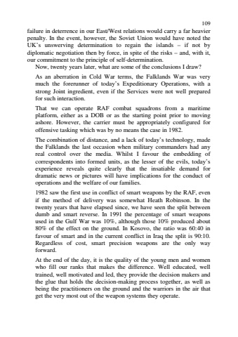 109failure in deterrence in our East/West relations would carry a far heavierpenalty. In the event, however, the Soviet Union would have noted theUK%u2019s unswerving determination to regain the islands %u2013 if not bydiplomatic negotiation then by force, in spite of the risks %u2013 and, with it,our commitment to the principle of self-determination.Now, twenty years later, what are some of the conclusions I draw?As an aberration in Cold War terms, the Falklands War was verymuch the forerunner of today%u2019s Expeditionary Operations, with astrong Joint ingredient, even if the Services were not well preparedfor such interaction.That we can operate RAF combat squadrons from a maritimeplatform, either as a DOB or as the starting point prior to movingashore. However, the carrier must be appropriately configured foroffensive tasking which was by no means the case in 1982.The combination of distance, and a lack of today%u2019s technology, madethe Falklands the last occasion when military commanders had anyreal control over the media. Whilst I favour the embedding ofcorrespondents into formed units, as the lesser of the evils, today%u2019sexperience reveals quite clearly that the insatiable demand fordramatic news or pictures will have implications for the conduct ofoperations and the welfare of our families.1982 saw the first use in conflict of smart weapons by the RAF, evenif the method of delivery was somewhat Heath Robinson. In thetwenty years that have elapsed since, we have seen the split betweendumb and smart reverse. In 1991 the percentage of smart weaponsused in the Gulf War was 10%, although those 10% produced about80% of the effect on the ground. In Kosovo, the ratio was 60:40 infavour of smart and in the current conflict in Iraq the split is 90:10.Regardless of cost, smart precision weapons are the only wayforward.At the end of the day, it is the quality of the young men and womenwho fill our ranks that makes the difference. Well educated, welltrained, well motivated and led, they provide the decision makers andthe glue that holds the decision-making process together, as well asbeing the practitioners on the ground and the warriors in the air thatget the very most out of the weapon systems they operate.