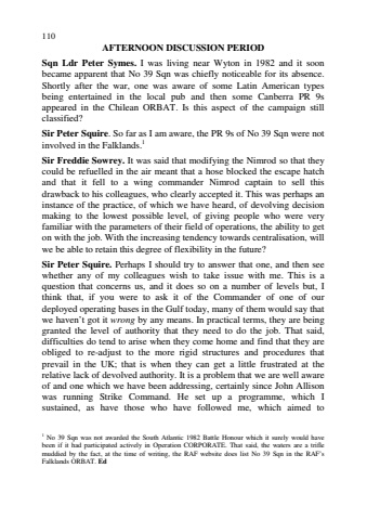110AFTERNOON DISCUSSION PERIODSqn Ldr Peter Symes. I was living near Wyton in 1982 and it soonbecame apparent that No 39 Sqn was chiefly noticeable for its absence.Shortly after the war, one was aware of some Latin American typesbeing entertained in the local pub and then some Canberra PR 9sappeared in the Chilean ORBAT. Is this aspect of the campaign stillclassified?Sir Peter Squire. So far as I am aware, the PR 9s of No 39 Sqn were notinvolved in the Falklands.1Sir Freddie Sowrey. It was said that modifying the Nimrod so that theycould be refuelled in the air meant that a hose blocked the escape hatchand that it fell to a wing commander Nimrod captain to sell thisdrawback to his colleagues, who clearly accepted it. This was perhaps aninstance of the practice, of which we have heard, of devolving decisionmaking to the lowest possible level, of giving people who were veryfamiliar with the parameters of their field of operations, the ability to geton with the job. With the increasing tendency towards centralisation, willwe be able to retain this degree of flexibility in the future?Sir Peter Squire. Perhaps I should try to answer that one, and then seewhether any of my colleagues wish to take issue with me. This is aquestion that concerns us, and it does so on a number of levels but, Ithink that, if you were to ask it of the Commander of one of ourdeployed operating bases in the Gulf today, many of them would say thatwe haven%u2019t got it wrong by any means. In practical terms, they are beinggranted the level of authority that they need to do the job. That said,difficulties do tend to arise when they come home and find that they areobliged to re-adjust to the more rigid structures and procedures thatprevail in the UK; that is when they can get a little frustrated at therelative lack of devolved authority. It is a problem that we are well awareof and one which we have been addressing, certainly since John Allisonwas running Strike Command. He set up a programme, which Isustained, as have those who have followed me, which aimed to1 No 39 Sqn was not awarded the South Atlantic 1982 Battle Honour which it surely would havebeen if it had participated actively in Operation CORPORATE. That said, the waters are a triflemuddied by the fact, at the time of writing, the RAF website does list No 39 Sqn in the RAF%u2019sFalklands ORBAT. Ed