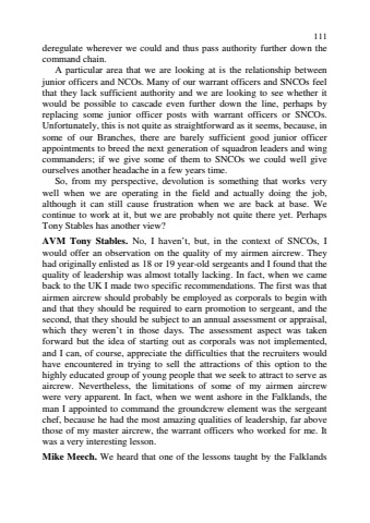 111deregulate wherever we could and thus pass authority further down thecommand chain.A particular area that we are looking at is the relationship betweenjunior officers and NCOs. Many of our warrant officers and SNCOs feelthat they lack sufficient authority and we are looking to see whether itwould be possible to cascade even further down the line, perhaps byreplacing some junior officer posts with warrant officers or SNCOs.Unfortunately, this is not quite as straightforward as it seems, because, insome of our Branches, there are barely sufficient good junior officerappointments to breed the next generation of squadron leaders and wingcommanders; if we give some of them to SNCOs we could well giveourselves another headache in a few years time.So, from my perspective, devolution is something that works verywell when we are operating in the field and actually doing the job,although it can still cause frustration when we are back at base. Wecontinue to work at it, but we are probably not quite there yet. PerhapsTony Stables has another view?AVM Tony Stables. No, I haven%u2019t, but, in the context of SNCOs, Iwould offer an observation on the quality of my airmen aircrew. Theyhad originally enlisted as 18 or 19 year-old sergeants and I found that thequality of leadership was almost totally lacking. In fact, when we cameback to the UK I made two specific recommendations. The first was thatairmen aircrew should probably be employed as corporals to begin withand that they should be required to earn promotion to sergeant, and thesecond, that they should be subject to an annual assessment or appraisal,which they weren%u2019t in those days. The assessment aspect was takenforward but the idea of starting out as corporals was not implemented,and I can, of course, appreciate the difficulties that the recruiters wouldhave encountered in trying to sell the attractions of this option to thehighly educated group of young people that we seek to attract to serve asaircrew. Nevertheless, the limitations of some of my airmen aircrewwere very apparent. In fact, when we went ashore in the Falklands, theman I appointed to command the groundcrew element was the sergeantchef, because he had the most amazing qualities of leadership, far abovethose of my master aircrew, the warrant officers who worked for me. Itwas a very interesting lesson.Mike Meech. We heard that one of the lessons taught by the Falklands