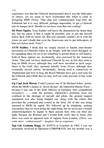 112experience was that the Chinook demonstrated that it was the helicopterof choice, yet we seem to have overlooked this when it came todesigning HMS Ocean. That ship was commissioned long after theFalklands but it is very difficult, perhaps impossible, to get a Chinookinto its hangar deck. Should we not have seen that one coming?Sir Peter Squire. Tony Stables will know the dimensions far better thanme, but my guess is that it might be possible, just, to get the aircraftbelow deck with its rotors off. But you certainly couldn%u2019t do it with therotors on and I doubt that even the Americans aim to put helicopters ofthat size below deck. Tony?AVM Stables. I think that we simply elected to handle inter-theatremovement of Chinooks either as air freight, with the rotors derigged, orby equipping them for air-to-air refuelling to permit them to self-deploy,both of these options are, incidentally, also exercised by the AmericanArmy. That said, we have deployed Chinook by sea; in fact they went toIraq on HMS Ocean, although they will have travelled as deck cargo.Once in the Gulf, they operated initially from Ocean, although theyeventually moved ashore. Incidentally, having used it extensively inAfghanistan and now in Iraq, the Royal Marines have got a real taste forthe Chinook and I think that we may well see some pressure to buy somemore.Gp Capt Jock Heron. Could I pursue one of Sir Richard Johns%u2019 points,about the MOD%u2019s failure to %u2018down declare%u2019 the G%u00fctersloh Harrier Force %u2013because I was one of the Staff Officers in Germany who sympathised(Laughter) %u2026%u2026..with the position. G%u00fctersloh%u2019s problems were notconfined to the shortage of aircraft and pilots, the ground supportequipment was also being shipped out, along with the cabins thatprovided the command and control in the field. All of this was beingreported to MOD by signal. We followed up by telephone, seekingreassurance that we were doing the right thing, but we never got a formalacknowledgement by signal. Is there anyone here who can shed anylight, because Sir Richard and I would both really like to know whythere was such an apparent lack of support from London. (There wassome more %u2013 embarrassed? %u2013 laughter, but no response)Sqn Ldr Graham Stagg. As SATCO at Leuchars in 1982, I was notpersonally involved in Operation CORPORATE, but my brother was a