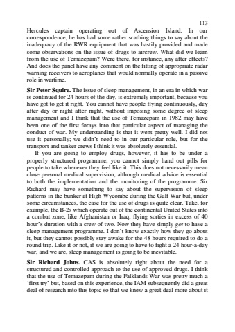 113Hercules captain operating out of Ascension Island. In ourcorrespondence, he has had some rather scathing things to say about theinadequacy of the RWR equipment that was hastily provided and madesome observations on the issue of drugs to aircrew. What did we learnfrom the use of Temazepam? Were there, for instance, any after effects?And does the panel have any comment on the fitting of appropriate radarwarning receivers to aeroplanes that would normally operate in a passiverole in wartime.Sir Peter Squire. The issue of sleep management, in an era in which waris continued for 24 hours of the day, is extremely important, because youhave got to get it right. You cannot have people flying continuously, dayafter day or night after night, without imposing some degree of sleepmanagement and I think that the use of Temazepam in 1982 may havebeen one of the first forays into that particular aspect of managing theconduct of war. My understanding is that it went pretty well. I did notuse it personally; we didn%u2019t need to in our particular role, but for thetransport and tanker crews I think it was absolutely essential.If you are going to employ drugs, however, it has to be under aproperly structured programme; you cannot simply hand out pills forpeople to take whenever they feel like it. This does not necessarily meanclose personal medical supervision, although medical advice is essentialto both the implementation and the monitoring of the programme. SirRichard may have something to say about the supervision of sleeppatterns in the bunker at High Wycombe during the Gulf War but, undersome circumstances, the case for the use of drugs is quite clear. Take, forexample, the B-2s which operate out of the continental United States intoa combat zone, like Afghanistan or Iraq, flying sorties in excess of 40hour%u2019s duration with a crew of two. Now they have simply got to have asleep management programme. I don%u2019t know exactly how they go aboutit, but they cannot possibly stay awake for the 48 hours required to do around trip. Like it or not, if we are going to have to fight a 24 hour-a-daywar, and we are, sleep management is going to be inevitable.Sir Richard Johns. CAS is absolutely right about the need for astructured and controlled approach to the use of approved drugs. I thinkthat the use of Temazepam during the Falklands War was pretty much a%u2018first try%u2019 but, based on this experience, the IAM subsequently did a greatdeal of research into this topic so that we knew a great deal more about it