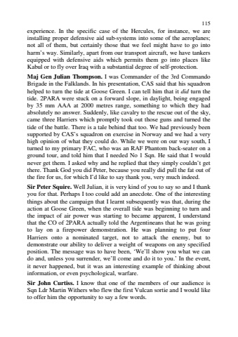 115experience. In the specific case of the Hercules, for instance, we areinstalling proper defensive aid sub-systems into some of the aeroplanes;not all of them, but certainly those that we feel might have to go intoharm%u2019s way. Similarly, apart from our transport aircraft, we have tankersequipped with defensive aids which permits them go into places likeKabul or to fly over Iraq with a substantial degree of self-protection.Maj Gen Julian Thompson. I was Commander of the 3rd CommandoBrigade in the Falklands. In his presentation, CAS said that his squadronhelped to turn the tide at Goose Green. I can tell him that it did turn thetide. 2PARA were stuck on a forward slope, in daylight, being engagedby 35 mm AAA at 2000 metres range, something to which they hadabsolutely no answer. Suddenly, like cavalry to the rescue out of the sky,came three Harriers which promptly took out those guns and turned thetide of the battle. There is a tale behind that too. We had previously beensupported by CAS%u2019s squadron on exercise in Norway and we had a veryhigh opinion of what they could do. While we were on our way south, Iturned to my primary FAC, who was an RAF Phantom back-seater on aground tour, and told him that I needed No 1 Sqn. He said that I wouldnever get them. I asked why and he replied that they simply couldn%u2019t getthere. Thank God you did Peter, because you really did pull the fat out ofthe fire for us, for which I%u2019d like to say thank you, very much indeed.Sir Peter Squire. Well Julian, it is very kind of you to say so and I thankyou for that. Perhaps I too could add an anecdote. One of the interestingthings about the campaign that I learnt subsequently was that, during theaction at Goose Green, when the overall tide was beginning to turn andthe impact of air power was starting to became apparent, I understandthat the CO of 2PARA actually told the Argentineans that he was goingto lay on a firepower demonstration. He was planning to put fourHarriers onto a nominated target, not to attack the enemy, but todemonstrate our ability to deliver a weight of weapons on any specifiedposition. The message was to have been, %u2018We%u2019ll show you what we cando and, unless you surrender, we%u2019ll come and do it to you.%u2019 In the event,it never happened, but it was an interesting example of thinking aboutinformation, or even psychological, warfare.Sir John Curtiss. I know that one of the members of our audience isSqn Ldr Martin Withers who flew the first Vulcan sortie and I would liketo offer him the opportunity to say a few words.
