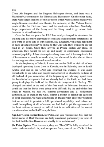 118Close Air Support and the Support Helicopter forces, and there was aMaritime/Air connection for Nimrod and Buccaneer. On the other hand,there were large sections of the air force which were almost exclusivelysingle-Service oriented; one thinks, for instance, of the Vulcan Force,much of the Air Defence Force and the air-to-air refuellers. Similarly,large proportions of the Army and the Navy used to go about theirbusiness in virtual isolation.Over the last ten years the RAF has totally changed its structure, itstraining and its entire approach to joint and expeditionary operations. Ifyou were to go to any of our stations, say Leuchars, you could tell themto pack up and get ready to move to the Gulf and they would be on theroad in 24 hours. Once they arrived at Prince Sultan Air Base, orwherever, they would be set up and ready to commence operationsextremely quickly. It has taken quite a long time, and it has required a lotof investment to enable us to do that, but the result is that the air forcehas undergone a fundamental transformation.At the beginning of March, I went out to the Gulf to visit all of ourdeployed operating bases (two in Kuwait; one in Bahrain; one in SaudiArabia and one in the UAE) and returned via Cyprus. It was quiteremarkable to see what our people had achieved in absolutely no time atall. Indeed, if you remember, at the beginning of February, apart fromthe handful of aeroplanes that we already had in the Gulf, we had beengoing to deploy the bulk of the British air component to Turkey. Wechanged our mind at the end of the first week in February, because wecould see that the Turks were going to be difficult. By the end of the firstweek in March, we had 100 combat aeroplanes and 27 helicoptersdeployed, all of them in the Gulf. Within a month of taking the decisionto swap locations, we were established in-theatre with all of the weaponsthat we needed to provide a full operational capability, and before wecould do anything at all, of course, we had had to get the agreement ofthe host nations to accept us. All of that is an indication of the recenttransformation in the RAF%u2019s capabilities.Sqn Ldr Colin Richardson. Sir Peter, can you reassure me, Sir, that thelatest marks of RAF Harriers are fully navalised, particularly in view ofthe fact that the Sea Harriers are shortly to be withdrawn?Sir Peter Squire. That is correct, they are. The GR7 is fully navalised inorder both to embark in, and to operate from, one of our CVSs. It has