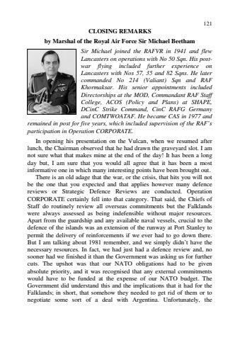 121CLOSING REMARKSby Marshal of the Royal Air Force Sir Michael BeethamSir Michael joined the RAFVR in 1941 and flewLancasters on operations with No 50 Sqn. His postwar flying included further experience onLancasters with Nos 57, 35 and 82 Sqns. He latercommanded No 214 (Valiant) Sqn and RAFKhormaksar. His senior appointments includedDirectorships at the MOD, Commandant RAF StaffCollege, ACOS (Policy and Plans) at SHAPE,DCinC Strike Command, CinC RAFG Germanyand COMTWOATAF. He became CAS in 1977 andremained in post for five years, which included supervision of the RAF%u2019sparticipation in Operation CORPORATE.In opening his presentation on the Vulcan, when we resumed afterlunch, the Chairman observed that he had drawn the graveyard slot. I amnot sure what that makes mine at the end of the day! It has been a longday but, I am sure that you would all agree that it has been a mostinformative one in which many interesting points have been brought out.There is an old adage that the war, or the crisis, that hits you will notbe the one that you expected and that applies however many defencereviews or Strategic Defence Reviews are conducted. OperationCORPORATE certainly fell into that category. That said, the Chiefs ofStaff do routinely review all overseas commitments but the Falklandswere always assessed as being indefensible without major resources.Apart from the guardship and any available naval vessels, crucial to thedefence of the islands was an extension of the runway at Port Stanley topermit the delivery of reinforcements if we ever had to go down there.But I am talking about 1981 remember, and we simply didn%u2019t have thenecessary resources. In fact, we had just had a defence review and, nosooner had we finished it than the Government was asking us for furthercuts. The upshot was that our NATO obligations had to be givenabsolute priority, and it was recognised that any external commitmentswould have to be funded at the expense of our NATO budget. TheGovernment did understand this and the implications that it had for theFalklands; in short, that somehow they needed to get rid of them or tonegotiate some sort of a deal with Argentina. Unfortunately, the