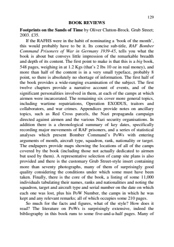 129BOOK REVIEWSFootprints on the Sands of Time by Oliver Clutton-Brock. Grub Street;2003. %u00a335.If the RAFHS were in the habit of nominating a %u2018book of the month%u2019,this would probably have to be it. Its concise sub-title, RAF BomberCommand Prisoners of War in Germany 1939-45, tells you what thebook is about but conveys little impression of the remarkable breadthand depth of its content. The first point to make is that this is a big book,548 pages, weighing in at 1.2 Kgs (that%u2019s 2 lbs 10 oz in real money), andmore than half of the content is in a very small typeface, probably 8point, so there is absolutely no shortage of information. The first half ofthe book provides a wide-ranging examination of the subject. The firsttwelve chapters provide a narrative account of events, and of thesignificant personalities involved in them, at each of the camps at whichairmen were incarcerated. The remaining six cover more general topics,including wartime repatriations, Operation EXODUS, traitors andcollaborators, and war crimes. Appendices provide notes on ancillarytopics, such as Red Cross parcels, the Nazi propaganda campaigndirected against airmen and the various Nazi security organisations. Inaddition there is a chronological summary of key dates, specificallyrecording major movements of RAF prisoners, and a series of statisticalanalyses which present Bomber Command%u2019s PoWs with enteringarguments of month, aircraft type, squadron, rank, nationality or target.The endpapers provide maps showing the locations of all of the campscovered by the book (including those not actually dedicated to airmenbut used by them). A representative selection of camp site plans is alsoprovided and there is the customary Grub Street-style insert containingmore than seventy photographs, many of them of surprisingly goodquality considering the conditions under which some must have beentaken. Finally, there is the core of the book, a listing of some 11,000individuals tabulating their names, ranks and nationalities and noting thesquadron, target and aircraft type and serial number on the date on whicheach one was lost, plus his PoW Number, the camps in which he waskept and any relevant remarks; all of which occupies some 210 pages.So much for the facts and figures, what of the style? How does itread? The literature on PoWs is surprisingly extensive, indeed thebibliography in this book runs to some five-and-a-half pages. Many of