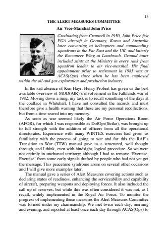 13THE ALERT MEASURES COMMITTEEAir Vice-Marshal John PriceGraduating from Cranwell in 1950, John Price fewFGA aircraft in Germany, Korea and Australialater converting to helicopters and commandingsquadrons in the Far East and the UK, and latterlythe Buccaneer Wing at Laarbruch. Ground toursincluded stints at the Ministry in every rank fromsquadron leader to air vice-marshal. His finalappointment prior to retirement in 1985 was asACAS(Ops) since when he has been employedwithin the oil and gas exploration and production industry.In the sad absence of Ken Hayr, Henry Probert has given us the bestavailable overview of MOD(AIR)%u2019s involvement in the Falklands war of1982. Moving down a rung, my task is to recall something of the days atthe coalface in Whitehall. I have not consulted the records and musttherefore give a health warning that these are my personal recollections,but from a time seared into my memory.As soon as war seemed likely the Air Force Operations Room(AFOR), for which I was responsible as DofOps(Strike), was brought upto full strength with the addition of officers from all the operationaldirectorates. Experience with many WINTEX exercises had given usfamiliarity with the process of going to war and for this the RAF%u2019sTransition to War (TTW) manual gave us a structured, well thoughtthrough, and I think, even with hindsight, logical procedure. So we werenot entirely in uncharted territory; although I had to remove %u2018Exercise,Exercise%u2019 from some early signals drafted by people who had not yet gotthe message. This peacetime syndrome arose on several other occasionsand I will give more examples later.The manual gave a series of Alert Measures covering actions such asdeclaring states of readiness, enhancing the serviceability and capabilityof aircraft, preparing weapons and deploying forces. It also included thecall up of reserves, but while this was often considered it was not, as Irecall, widely implemented in the Royal Air Force. To monitor theprogress of implementing these measures the Alert Measures Committeewas formed under my chairmanship. We met twice each day, morningand evening, and reported at least once each day through ACAS(Ops) to
