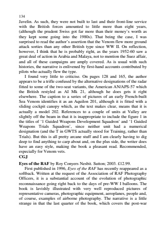 134Javelin. As such, they were not built to last and their front-line servicewith the British forces amounted to little more than eight years,(although the prudent Swiss got far more than their money%u2019s worth asthey kept some going into the 1980s). That being the case, I wassurprised to read the author%u2019s assertion that the Venom flew more groundattack sorties than any other British type since WW II. On reflection,however, I think that he is probably right, as the years 1952-60 saw agreat deal of action in Arabia and Malaya, not to mention the Suez affair,and all of these campaigns are amply covered. As is usual with suchhistories, the narrative is enlivened by first-hand accounts contributed bypilots who actually flew the type.I found very little to criticise. On pages 128 and 165, the authorappears to be a trifle confused by the alternative designations of the radarfitted to some of the two-seat variants, the American AN/APS-57 whichthe British restyled as AI Mk 21, although he does gets it rightelsewhere. The caption to a series of pictures of an early French-builtSea Venom identifies it as an Aquilon 201, although it is fitted with asliding cockpit canopy which, as the text makes clear, means that it isactually a model 202. References to a couple of units at Valley areslightly off the beam in that it is inappropriate to include the figure 1 inthe titles of %u20181 Guided Weapons Development Squadron%u2019 and %u20181 GuidedWeapons Trials Squadron%u2019, since neither unit had a numericaldesignation (and the T in GWTS actually stood for Training, rather thanTrials). But this is all pretty arcane stuff and I am clearly having to digdeep to find anything to carp about and, on the plus side, the writer doeshave an easy style, making the book a pleasant read. Recommended,especially for Venom vets.CGJEyes of the RAF by Roy Conyers Nesbit. Sutton; 2003. %u00a312.99.First published in 1996, Eyes of the RAF has recently reappeared as asoftback. Written at the request of the Association of RAF PhotographyOfficers, it is a substantial account of the evolution of photographicreconnaissance going right back to the days of pre-WW I balloons. Thebook is lavishly illustrated with very well reproduced pictures ofrepresentative cameras, photographic equipment, aeroplanes, people and,of course, examples of airborne photography. The narrative is a littlestrange in that the last quarter of the book, which covers the post-war