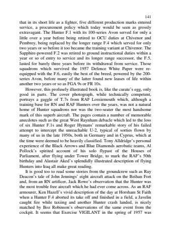 141that in its short life as a fighter, five different production marks enteredservice, a procurement policy which today would be seen as grosslyextravagant. The Hunter F.1 with its 100-series Avon served for only alittle over a year before being retired to OCU duties at Chivenor andPembrey, being replaced by the longer range F.4 which served for onlytwo years or so before it too became the training variant at Chivenor. TheSapphire-powered F.2 was retired to ground instructional duties within ayear or so of entry to service and its longer range successor, the F.5,lasted for barely three years before its withdrawal from service. Thosesquadrons which survived the 1957 Defence White Paper were reequipped with the F.6, easily the best of the breed, powered by the 200-series Avon, before many of the latter found new leases of life withinanother two years or so as FGA 9s or FR 10s.However, this profusely illustrated book is, like the curate%u2019s egg, onlygood in parts. The cover photograph, while technically competent,portrays a gaggle of T.7s from RAF Lossiemouth which, although atraining base for RN and RAF Hunters over the years, was not a naturalhome of Hunter squadrons nor was the two-seater the most handsomemark of this superb aircraft. The pages contain a number of memorableanecdotes such as the great West Raynham debacle which led to the lossof six Hunter F.1s and Roger Hymans%u2019 remarkable story of his failedattempt to intercept the unreachable U-2, typical of sorties flown bymany of us in the late 1950s, both in Germany and in Cyprus, which atthe time were deemed to be heavily classified. Tony Alldridge%u2019s personalexperience of the Black Arrows and Blue Diamonds aerobatic teams, AlPollock%u2019s spirited account of his solo flypast of the Houses ofParliament, after flying under Tower Bridge, to mark the RAF%u2019s 50thbirthday and Alastair Aked%u2019s splendidly illustrated description of flyingHunters into Iraq all make great reading.It is good too to read some stories from the groundcrew such as RayDeacon%u2019s tale of John Jennings%u2019 eight aircraft attack on the Beihan Fortand, from an RN artificer, Jack Rowe%u2019s observation that the Hunter wasthe most trouble free aircraft which he had ever come across. As an RAFarmourer, Ken Hazell%u2019s vivid description of the day at Horsham St Faithwhen a Hunter F.4 aborted its take off and finished in a field, a Javelincaught fire while taxiing and another Hunter crash landed, is nicelymatched by Boz Robinson%u2019s observations of the same event from thecockpit. It seems that Exercise VIGILANT in the spring of 1957 was