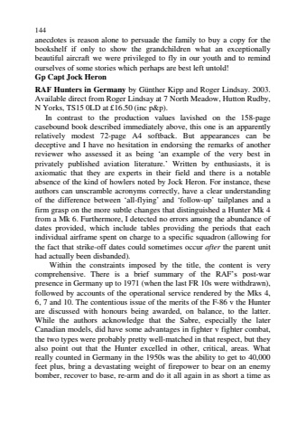 144anecdotes is reason alone to persuade the family to buy a copy for thebookshelf if only to show the grandchildren what an exceptionallybeautiful aircraft we were privileged to fly in our youth and to remindourselves of some stories which perhaps are best left untold!Gp Capt Jock HeronRAF Hunters in Germany by G%u00fcnther Kipp and Roger Lindsay. 2003.Available direct from Roger Lindsay at 7 North Meadow, Hutton Rudby,N Yorks, TS15 0LD at %u00a316.50 (inc p&p).In contrast to the production values lavished on the 158-pagecasebound book described immediately above, this one is an apparentlyrelatively modest 72-page A4 softback. But appearances can bedeceptive and I have no hesitation in endorsing the remarks of anotherreviewer who assessed it as being %u2018an example of the very best inprivately published aviation literature.%u2019 Written by enthusiasts, it isaxiomatic that they are experts in their field and there is a notableabsence of the kind of howlers noted by Jock Heron. For instance, theseauthors can unscramble acronyms correctly, have a clear understandingof the difference between %u2018all-flying%u2019 and %u2018follow-up%u2019 tailplanes and afirm grasp on the more subtle changes that distinguished a Hunter Mk 4from a Mk 6. Furthermore, I detected no errors among the abundance ofdates provided, which include tables providing the periods that eachindividual airframe spent on charge to a specific squadron (allowing forthe fact that strike-off dates could sometimes occur after the parent unithad actually been disbanded). Within the constraints imposed by the title, the content is verycomprehensive. There is a brief summary of the RAF%u2019s post-warpresence in Germany up to 1971 (when the last FR 10s were withdrawn),followed by accounts of the operational service rendered by the Mks 4,6, 7 and 10. The contentious issue of the merits of the F-86 v the Hunterare discussed with honours being awarded, on balance, to the latter.While the authors acknowledge that the Sabre, especially the laterCanadian models, did have some advantages in fighter v fighter combat,the two types were probably pretty well-matched in that respect, but theyalso point out that the Hunter excelled in other, critical, areas. Whatreally counted in Germany in the 1950s was the ability to get to 40,000feet plus, bring a devastating weight of firepower to bear on an enemybomber, recover to base, re-arm and do it all again in as short a time as