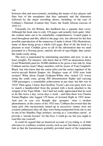 146between slim and non-existent), including the names of key players andfleet lists of the aeroplanes that they operated; and the itinerariesfollowed by the major travelling shows, including, in the case ofCobham%u2019s National Aviation Day Tours, the South African exercise of1932-33.Unusually for Air Britain, this hardback has a separate dust cover.Although the book runs to only 128 pages and actually feels quite %u2018slim%u2019the content turns out to be remarkably comprehensive. Coated paper isused throughout and this, allied to the page size, has allowed for the bestpossible reproduction of the numerous (I made it about 150) illustrations,many of them being given a whole (A4) page. Best of all, the book is apleasure to read. Cruddas gives us all of the information that we needpresented in a flowing prose, entirely devoid of typo-blight, that carriesthe reader easily along.The story is punctuated by entertaining anecdotes and new, to me atleast, insights. For instance, who knew that in 1929 an anonymous donor(Lord Wakefield) paid for 10,000 children to be given a free ride by AlanCobham and his team? Many members will be aware of Tom CampbellBlack, but who knew that the senior pilot and the senior engineer of histwelve-aircraft British Empire Air Displays team of 1936 were bothwomen? What about Claude Grahame-White who visited 121 townsalong the south coast, giving 500 demonstration flights and carrying1200 passengers; a remarkable achievement at any time, but this was in1914! Then again, I knew that Geoffrey Tyson%u2019s pre-war party trick wasto snatch a handkerchief from the ground with a hook attached to thewingtip of his Tiger Moth %u2013 but I had not really appreciated that he usedto do this twice a day, seven days a week %u2013 and then there was CharlesTurner-Hughes who logged 170 hours of inverted flight in 1932 alone.And just in case you thought that %u2018groupies%u2019 were a modernphenomenon, in the course of his 1932 tour, Cobham discovered that thesame girls who mysteriously turned up at successive venues were notaviation enthusiasts after all; they were being transported from site to sitein one of his Handley Page airliners, serving as a %u2018concubine carrier%u2019, toprovide a %u2018morale booster%u2019 for the boys. I could go on, but you ought toread this one yourself.It could be argued that an historical account of joy-riding is of littlerelevance to a military aviation society such as ours but there is a definitelink in that the barnstormers probably provided much of the inspiration