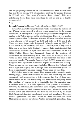 147that led people to join the RAFVR. It is claimed that, when asked if theyhad ever flown before, 75% of candidates applying for aircrew trainingin 1939-40 said, %u2018Yes, with Cobham%u2019s flying circus%u2019. This veryentertaining book does have something to tell us and it is highlyrecommended.CGJBeyond Courage by Norman Franks. Grub Street; 2003. %u00a318.99In Another Kind of Courage Norman Franks recounted the exploits ofthe Walrus crews engaged in air-sea rescue operations in the watersaround the UK during WW II. Beyond Courage completes the picture bydealing with Walrus rescues in the Mediterranean. I have a few nigglesover the presentation. For instance, why use full stops instead of hyphenswhen referring to US aircraft? eg P.38 and B.25 for P-38 and B-25.There are some imprecisely designated Luftwaffe units, eg JG/52 forJG52, 2/SGK 10 for 2./SKG10 and 2/(F)123 for 2.(F)/123; it only takes alittle care to get them right. Similarly, I suspect that a tragic incident thatoccurred at Cutella on 29 April 1944 involved Thunderbolts of the US325th Fighter Group (not Squadron). Some of the locations ofaerodromes are also seriously adrift, Abu Sueir, for example, was not%u2018some 20 miles south of Alexandria%u2019; it was more than 100 miles to theeast, near Ismailia. Then again, Burgh-el-Arab (LG39) was nowhere nearBenghazi and Capodichino is close to Naples, not on the heel of Italy.There are one or two stray typos, including Halwen (for Helwan) andHMS Argos (for Argus), and a passage from a contribution by FS J AReid is reproduced twice, once on page 91 and again on page 132.While it is a pity that this sort of thing was not picked up at the proofreading stage, I should not overstate the case. The reader may find suchoccasional careless oversights a little annoying but few of them havemuch impact on the tale that is being told. One rescue was pretty muchlike another, of course, so it is inevitable that the narrative maysometimes seem to be a little repetitive. This problem is minimised,however, by numerous, and sometimes quite lengthy, contributions bymany of the veterans, both rescuers and rescuees, whom the author hastracked down and interviewed. The book is rounded off by the usualGrub Street-style insert of snapshots of people and aeroplanes. There areseveral appendices; the most useful of these tabulates the mainMediterranean rescues in which a Walrus participated, providing, date,