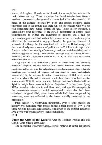 150whom, Hollinghust, Gould-Lee and Leask, for example, had reached airrank before retiring. There are even first hand recollections from anumber of observers, the generally overlooked tribe who actually didmuch of the damage inflicted by %u2018Fees%u2019 and Bristol Fighters. Theseinterludes add to the texture and there will be few readers who will notfind something new buried within the text. There is, for instance, atantalisingly brief reference to the RFC%u2019s monitoring of enemy radiotransmissions to trigger the launching of fighters and I had notpreviously appreciated that, within the German air service, only a regularofficer could command a Jagdgeschwader. In practice, because ofseniority, if nothing else, the same tended to be true of British wings, butthis was clearly not a matter of policy as Lt-Col Louis Strange (whofeatures in the book as a significant early, and late, aerial tactician) was anotably aggressive Wing Commander. Strange was no career officer,however; an RFC Special Reservist in 1913, he was back in civviesbefore the end of 1919.Dog-Fight is also particularly good at amplifying the differingattitudes adopted by the various air forces towards, and policiesimplemented to govern, the validation of combat claims. This is hardlybreaking new ground, of course, but one point is made particularlygraphically by the previously noted re-assessment of Ball%u2019s forty-fourvictories, which, the author reasons, would have been more like twentyseven using WW II rules, whereas Johnnie Johnson%u2019s thirty-eight onSpitfires might have been as high as fifty-nine if he had been flyingSE5as. Another point that is well illustrated, with specific examples, isthe remarkable extent to which recognised claims that had beensubmitted in good faith, even those which had been supported bywitnesses, were not reflected in the losses actually sustained by theopposition.Final verdict? A worthwhile investment, even if your shelves arealready well-furnished with books on the fighter pilots of WW I. Forthose who do not have a reasonably firm grasp of the subject, however,Dog-Fight will provide a very sound foundation.CGJUnder the Guns of the Kaiser%u2019s Aces by Norman Franks and HalGiblin. Grub Street; 2003. %u00a320.The successful Under the Guns%u2026 series, reviews in depth the victory