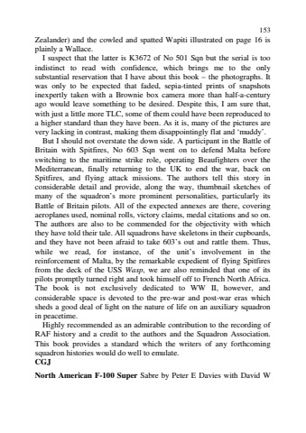 153Zealander) and the cowled and spatted Wapiti illustrated on page 16 isplainly a Wallace.I suspect that the latter is K3672 of No 501 Sqn but the serial is tooindistinct to read with confidence, which brings me to the onlysubstantial reservation that I have about this book %u2013 the photographs. Itwas only to be expected that faded, sepia-tinted prints of snapshotsinexpertly taken with a Brownie box camera more than half-a-centuryago would leave something to be desired. Despite this, I am sure that,with just a little more TLC, some of them could have been reproduced toa higher standard than they have been. As it is, many of the pictures arevery lacking in contrast, making them disappointingly flat and %u2018muddy%u2019.But I should not overstate the down side. A participant in the Battle ofBritain with Spitfires, No 603 Sqn went on to defend Malta beforeswitching to the maritime strike role, operating Beaufighters over theMediterranean, finally returning to the UK to end the war, back onSpitfires, and flying attack missions. The authors tell this story inconsiderable detail and provide, along the way, thumbnail sketches ofmany of the squadron%u2019s more prominent personalities, particularly itsBattle of Britain pilots. All of the expected annexes are there, coveringaeroplanes used, nominal rolls, victory claims, medal citations and so on.The authors are also to be commended for the objectivity with whichthey have told their tale. All squadrons have skeletons in their cupboards,and they have not been afraid to take 603%u2019s out and rattle them. Thus,while we read, for instance, of the unit%u2019s involvement in thereinforcement of Malta, by the remarkable expedient of flying Spitfiresfrom the deck of the USS Wasp, we are also reminded that one of itspilots promptly turned right and took himself off to French North Africa.The book is not exclusively dedicated to WW II, however, andconsiderable space is devoted to the pre-war and post-war eras whichsheds a good deal of light on the nature of life on an auxiliary squadronin peacetime.Highly recommended as an admirable contribution to the recording ofRAF history and a credit to the authors and the Squadron Association.This book provides a standard which the writers of any forthcomingsquadron histories would do well to emulate.CGJNorth American F-100 Super Sabre by Peter E Davies with David W
