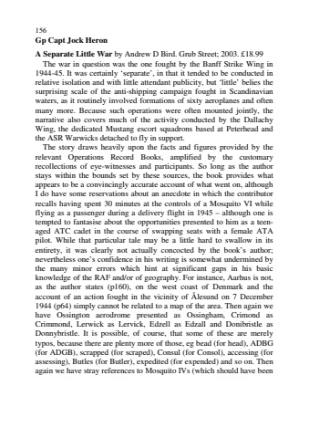 156Gp Capt Jock HeronA Separate Little War by Andrew D Bird. Grub Street; 2003. %u00a318.99The war in question was the one fought by the Banff Strike Wing in1944-45. It was certainly %u2018separate%u2019, in that it tended to be conducted inrelative isolation and with little attendant publicity, but %u2018little%u2019 belies thesurprising scale of the anti-shipping campaign fought in Scandinavianwaters, as it routinely involved formations of sixty aeroplanes and oftenmany more. Because such operations were often mounted jointly, thenarrative also covers much of the activity conducted by the DallachyWing, the dedicated Mustang escort squadrons based at Peterhead andthe ASR Warwicks detached to fly in support.The story draws heavily upon the facts and figures provided by therelevant Operations Record Books, amplified by the customaryrecollections of eye-witnesses and participants. So long as the authorstays within the bounds set by these sources, the book provides whatappears to be a convincingly accurate account of what went on, althoughI do have some reservations about an anecdote in which the contributorrecalls having spent 30 minutes at the controls of a Mosquito VI whileflying as a passenger during a delivery flight in 1945 %u2013 although one istempted to fantasise about the opportunities presented to him as a teenaged ATC cadet in the course of swapping seats with a female ATApilot. While that particular tale may be a little hard to swallow in itsentirety, it was clearly not actually concocted by the book%u2019s author;nevertheless one%u2019s confidence in his writing is somewhat undermined bythe many minor errors which hint at significant gaps in his basicknowledge of the RAF and/or of geography. For instance, Aarhus is not,as the author states (p160), on the west coast of Denmark and theaccount of an action fought in the vicinity of %u00c5lesund on 7 December1944 (p64) simply cannot be related to a map of the area. Then again wehave Ossington aerodrome presented as Ossingham, Crimond asCrimmond, Lerwick as Lervick, Edzell as Edzall and Donibristle asDonnybristle. It is possible, of course, that some of these are merelytypos, because there are plenty more of those, eg bead (for head), ADBG(for ADGB), scrapped (for scraped), Consul (for Consol), accessing (forassessing), Butles (for Butler), expedited (for expended) and so on. Thenagain we have stray references to Mosquito IVs (which should have been