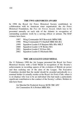 160THE TWO AIR FORCES AWARDIn 1996 the Royal Air Force Historical Society established, incollaboration with its American sister organisation, the Air ForceHistorical Foundation, the Two Air Forces Award, which was to bepresented annually on each side of the Atlantic in recognition ofoutstanding academic work by a serving officer or airman. The RAFwinners have been:1997 Wing Commander M P Brzezicki MPhil MIL1998 Wing Commander P J Daybell MBE MA BA1999 Squadron Leader S P Harpum MSc BSc MILT2000 Squadron Leader A W Riches MA2001 Squadron Leader C H Goss MA2002 Squadron Leader S I Richards BScTHE AIR LEAGUE GOLD MEDALOn 11 February 1998 the Air League presented the Royal Air ForceHistorical Society with a Gold Medal in recognition of the Society%u2019sachievements in recording aspects of the evolution of British air powerand thus realising one of the aims of the League. The ExecutiveCommittee decided that the medal should be awarded periodically to anominal holder (it actually resides at the Royal Air Force Club, where itis on display) who was to be an individual who had made a particularlysignificant contribution to the conduct of the Society%u2019s affairs. Holders todate have been:Air Marshal Sir Frederick Sowrey KCB CBE AFCAir Commodore H A Probert MBE MA