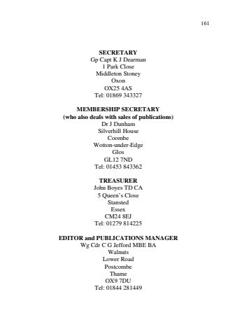 161SECRETARYGp Capt K J Dearman1 Park CloseMiddleton StoneyOxonOX25 4ASTel: 01869 343327MEMBERSHIP SECRETARY(who also deals with sales of publications)Dr J DunhamSilverhill HouseCoombeWotton-under-EdgeGlosGL12 7NDTel: 01453 843362TREASURERJohn Boyes TD CA5 Queen%u2019s CloseStanstedEssexCM24 8EJTel: 01279 814225EDITOR and PUBLICATIONS MANAGERWg Cdr C G Jefford MBE BAWalnutsLower RoadPostcombeThameOX9 7DUTel: 01844 281449