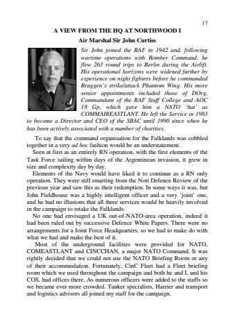17A VIEW FROM THE HQ AT NORTHWOOD IAir Marshal Sir John CurtissSir John joined the RAF in 1942 and, followingwartime operations with Bomber Command, heflew 263 round trips to Berlin during the Airlift.His operational horizons were widened further byexperience on night fighters before he commandedBruggen%u2019s strike/attack Phantom Wing. His moresenior appointments included those of DOrg,Commandant of the RAF Staff College and AOC18 Gp, which gave him a NATO %u2018hat%u2019 asCOMMAIREASTLANT. He left the Service in 1983to become a Director and CEO of the SBAC until 1990 since when hehas been actively associated with a number of charities.To say that the command organisation for the Falklands was cobbledtogether in a very ad hoc fashion would be an understatement.Seen at first as an entirely RN operation, with the first elements of theTask Force sailing within days of the Argentinean invasion, it grew insize and complexity day by day.Elements of the Navy would have liked it to continue as a RN onlyoperation. They were still smarting from the Nott Defence Review of theprevious year and saw this as their redemption. In some ways it was, butJohn Fieldhouse was a highly intelligent officer and a very %u2018joint%u2019 one,and he had no illusions that all three services would be heavily involvedin the campaign to retake the Falklands.No one had envisaged a UK out-of-NATO-area operation, indeed ithad been ruled out by successive Defence White Papers. There were noarrangements for a Joint Force Headquarters, so we had to make do withwhat we had and make the best of it.Most of the underground facilities were provided for NATO,COMEASTLANT and CINCCHAN, a major NATO Command. It wasrightly decided that we could not use the NATO Briefing Room or anyof their accommodation. Fortunately, CinC Fleet had a Fleet briefingroom which we used throughout the campaign and both he and I, and hisCOS, had offices there. As numerous officers were added to the staffs sowe became ever more crowded. Tanker specialists, Harrier and transportand logistics advisors all joined my staff for the campaign.