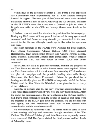 18Within days of the decision to launch a Task Force I was appointedAir Commander with responsibility for all RAF aircraft deployedforward in support. I became part of the Command team under AdmiralFieldhouse known at first as the FLAIR (Flag and Air Officers) and lateras the FLAIRGO when the Army sent a General to join us when 5Brigade was added to the ORB and Jeremy Moore went South in theQE2.I had one personal asset that stood me in good stead for this campaign.During my RAF career of forty years I had served in every operationalcommand and had flown in every aircraft type committed to the war,except for the Harrier; although I made up for that after the operationwas over.The other members of the FLAIR were: Admiral Sir Peter Herbert,Flag Officer Submarines; Admiral Halifax, COS Fleet; AdmiralHammersley, Fleet Engineering Officer; and General Jeremy Moore,Royal Marines. Lieutenant General Trant joined later. When 5 Brigadewas added the CinC had land forces of some 10,500 men undercommand.The FLAIR met daily to plan the campaign, monitor the progress ofthe Task Force and decide on what further assets were required. Whenthe Task Force arrived off Ascension we flew down by VC10 to discussthe plan of campaign and the possible landing sites with SandyWoodward, the Task Force Commander. Before the go ahead for alanding was finally given the FLAIRGO subsequently briefed the PrimeMinister and the War Cabinet in Whitehall on our plans for the recoveryof the Falklands.Despite, or perhaps due to, the very crowded accommodation, theTask Force Headquarters worked very well and very harmoniously. Afterthe end of the campaign one of the naval officers in the HQ said that theyhad drawn great confidence from the sounds of laughter that came fromthe meetings of the FLAIR just down the corridor. We did not take ourtask lightly, but John Fieldhouse knew how to mix humour withdetermination and the attention to detail.We were subject to numerous visits. The Prime Minister came to threeof our evening briefings and sometimes brought members of her WarCabinet. The Duke of Edinburgh and John Nott came separately two orthree times and HM The Queen visited the Headquarters and had lunchat Admiralty House.