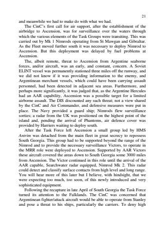 21and meanwhile we had to make do with what we had.The CinC%u2019s first call for air support, after the establishment of theairbridge to Ascension, was for surveillance over the waters throughwhich the various elements of the Task Groups were transiting. This wascarried out by Mk 1 Nimrods operating from St Mawgan and Gibraltar.As the Fleet moved further south it was necessary to deploy Nimrod toAscension. But this deployment was delayed by fuel problems atAscension.The, albeit remote, threat to Ascension from Argentine seaborneforces, and/or aircraft, was an early, and constant, concern. A SovietELINT vessel was permanently stationed three miles off the runway, andwe did not know if it was providing information to the enemy, andArgentinean merchant vessels, which could have been carrying assaultpersonnel, had been detected in adjacent sea areas. Furthermore, andperhaps more significantly, it was judged that, as the Argentine Herculeshad an AAR capability, Ascension was a possible target for a limitedairborne assault. The DIS discounted any such threat; not a view sharedby the CinC and Air Commander, and defensive measures were put inplace. The Navy provided a guard ship; Nimrods flew surveillancesorties; a radar from the UK was positioned on the highest point of theisland and, pending the arrival of Phantoms, air defence cover wasprovided by Harriers waiting to deploy south.After the Task Force left Ascension a small group led by HMSAntrim was detached from the main fleet in great secrecy to repossessSouth Georgia. This group had to be supported beyond the range of theNimrod and to provide the necessary surveillance Victors, to operate inthe MRR role were deployed to Ascension. Supported by AAR Victorsthese aircraft covered the areas down to South Georgia some 3000 milesfrom Ascension. The Victor continued in this role until the arrival of theAAR capable, Searchwater radar equipped, Nimrod Mk 2. This radarcould detect and classify surface contacts from high level and long range.You will hear more of this later but I believe, with hindsight, that wewere expecting too much, too soon, of this newly introduced and verysophisticated equipment.Following the recapture in late April of South Georgia the Task Forceturned its attention to the Falklands. The CinC was concerned thatArgentinean fighter/attack aircraft would be able to operate from Stanleyand pose a threat to his ships, particularly the carriers. To deny high