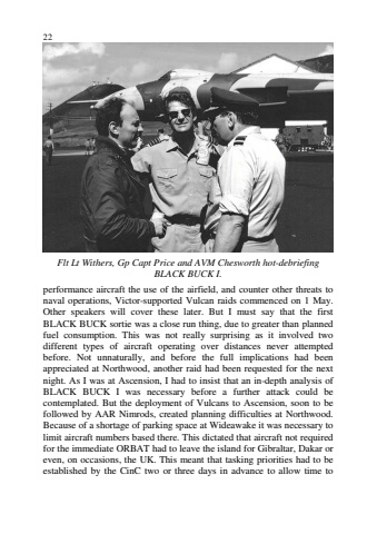 22Flt Lt Withers, Gp Capt Price and AVM Chesworth hot-debriefingBLACK BUCK I.performance aircraft the use of the airfield, and counter other threats tonaval operations, Victor-supported Vulcan raids commenced on 1 May.Other speakers will cover these later. But I must say that the firstBLACK BUCK sortie was a close run thing, due to greater than plannedfuel consumption. This was not really surprising as it involved twodifferent types of aircraft operating over distances never attemptedbefore. Not unnaturally, and before the full implications had beenappreciated at Northwood, another raid had been requested for the nextnight. As I was at Ascension, I had to insist that an in-depth analysis ofBLACK BUCK I was necessary before a further attack could becontemplated. But the deployment of Vulcans to Ascension, soon to befollowed by AAR Nimrods, created planning difficulties at Northwood.Because of a shortage of parking space at Wideawake it was necessary tolimit aircraft numbers based there. This dictated that aircraft not requiredfor the immediate ORBAT had to leave the island for Gibraltar, Dakar oreven, on occasions, the UK. This meant that tasking priorities had to beestablished by the CinC two or three days in advance to allow time to