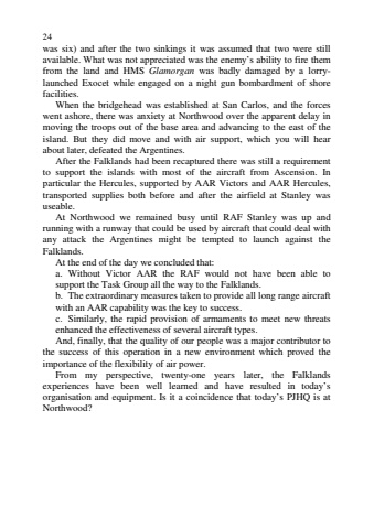 24was six) and after the two sinkings it was assumed that two were stillavailable. What was not appreciated was the enemy%u2019s ability to fire themfrom the land and HMS Glamorgan was badly damaged by a lorrylaunched Exocet while engaged on a night gun bombardment of shorefacilities.When the bridgehead was established at San Carlos, and the forceswent ashore, there was anxiety at Northwood over the apparent delay inmoving the troops out of the base area and advancing to the east of theisland. But they did move and with air support, which you will hearabout later, defeated the Argentines.After the Falklands had been recaptured there was still a requirementto support the islands with most of the aircraft from Ascension. Inparticular the Hercules, supported by AAR Victors and AAR Hercules,transported supplies both before and after the airfield at Stanley wasuseable.At Northwood we remained busy until RAF Stanley was up andrunning with a runway that could be used by aircraft that could deal withany attack the Argentines might be tempted to launch against theFalklands.At the end of the day we concluded that:a. Without Victor AAR the RAF would not have been able tosupport the Task Group all the way to the Falklands.b. The extraordinary measures taken to provide all long range aircraftwith an AAR capability was the key to success.c. Similarly, the rapid provision of armaments to meet new threatsenhanced the effectiveness of several aircraft types.And, finally, that the quality of our people was a major contributor tothe success of this operation in a new environment which proved theimportance of the flexibility of air power.From my perspective, twenty-one years later, the Falklandsexperiences have been well learned and have resulted in today%u2019sorganisation and equipment. Is it a coincidence that today%u2019s PJHQ is atNorthwood?