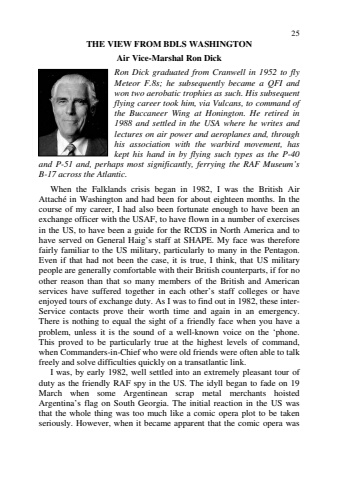 25THE VIEW FROM BDLS WASHINGTONAir Vice-Marshal Ron DickRon Dick graduated from Cranwell in 1952 to flyMeteor F.8s; he subsequently became a QFI andwon two aerobatic trophies as such. His subsequentflying career took him, via Vulcans, to command ofthe Buccaneer Wing at Honington. He retired in1988 and settled in the USA where he writes andlectures on air power and aeroplanes and, throughhis association with the warbird movement, haskept his hand in by flying such types as the P-40and P-51 and, perhaps most significantly, ferrying the RAF Museum%u2019sB-17 across the Atlantic.When the Falklands crisis began in 1982, I was the British AirAttach%u00e9 in Washington and had been for about eighteen months. In thecourse of my career, I had also been fortunate enough to have been anexchange officer with the USAF, to have flown in a number of exercisesin the US, to have been a guide for the RCDS in North America and tohave served on General Haig%u2019s staff at SHAPE. My face was thereforefairly familiar to the US military, particularly to many in the Pentagon.Even if that had not been the case, it is true, I think, that US militarypeople are generally comfortable with their British counterparts, if for noother reason than that so many members of the British and Americanservices have suffered together in each other%u2019s staff colleges or haveenjoyed tours of exchange duty. As I was to find out in 1982, these interService contacts prove their worth time and again in an emergency.There is nothing to equal the sight of a friendly face when you have aproblem, unless it is the sound of a well-known voice on the %u2018phone.This proved to be particularly true at the highest levels of command,when Commanders-in-Chief who were old friends were often able to talkfreely and solve difficulties quickly on a transatlantic link.I was, by early 1982, well settled into an extremely pleasant tour ofduty as the friendly RAF spy in the US. The idyll began to fade on 19March when some Argentinean scrap metal merchants hoistedArgentina%u2019s flag on South Georgia. The initial reaction in the US wasthat the whole thing was too much like a comic opera plot to be takenseriously. However, when it became apparent that the comic opera was