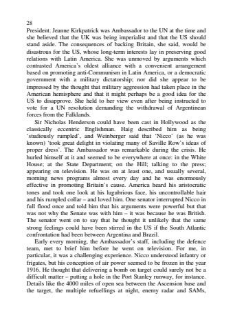 28President. Jeanne Kirkpatrick was Ambassador to the UN at the time andshe believed that the UK was being imperialist and that the US shouldstand aside. The consequences of backing Britain, she said, would bedisastrous for the US, whose long-term interests lay in preserving goodrelations with Latin America. She was unmoved by arguments whichcontrasted America%u2019s oldest alliance with a convenient arrangementbased on promoting anti-Communism in Latin America, or a democraticgovernment with a military dictatorship; nor did she appear to beimpressed by the thought that military aggression had taken place in theAmerican hemisphere and that it might perhaps be a good idea for theUS to disapprove. She held to her view even after being instructed tovote for a UN resolution demanding the withdrawal of Argentineanforces from the Falklands.Sir Nicholas Henderson could have been cast in Hollywood as theclassically eccentric Englishman. Haig described him as being%u2018studiously rumpled%u2019, and Weinberger said that %u2018Nicco%u2019 (as he wasknown) %u2018took great delight in violating many of Saville Row%u2019s ideas ofproper dress%u2019. The Ambassador was remarkable during the crisis. Hehurled himself at it and seemed to be everywhere at once: in the WhiteHouse; at the State Department; on the Hill; talking to the press;appearing on television. He was on at least one, and usually several,morning news programs almost every day and he was enormouslyeffective in promoting Britain%u2019s cause. America heard his aristocratictones and took one look at his lugubrious face, his uncontrollable hairand his rumpled collar %u2013 and loved him. One senator interrupted Nicco infull flood once and told him that his arguments were powerful but thatwas not why the Senate was with him %u2013 it was because he was British.The senator went on to say that he thought it unlikely that the samestrong feelings could have been stirred in the US if the South Atlanticconfrontation had been between Argentina and Brazil.Early every morning, the Ambassador%u2019s staff, including the defenceteam, met to brief him before he went on television. For me, inparticular, it was a challenging experience. Nicco understood infantry orfrigates, but his conception of air power seemed to be frozen in the year1916. He thought that delivering a bomb on target could surely not be adifficult matter %u2013 putting a hole in the Port Stanley runway, for instance.Details like the 4000 miles of open sea between the Ascension base andthe target, the multiple refuellings at night, enemy radar and SAMs,