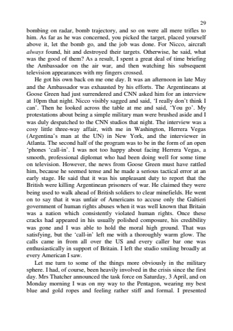 29bombing on radar, bomb trajectory, and so on were all mere trifles tohim. As far as he was concerned, you picked the target, placed yourselfabove it, let the bomb go, and the job was done. For Nicco, aircraftalways found, hit and destroyed their targets. Otherwise, he said, whatwas the good of them? As a result, I spent a great deal of time briefingthe Ambassador on the air war, and then watching his subsequenttelevision appearances with my fingers crossed.He got his own back on me one day. It was an afternoon in late Mayand the Ambassador was exhausted by his efforts. The Argentineans atGoose Green had just surrendered and CNN asked him for an interviewat 10pm that night. Nicco visibly sagged and said, %u2018I really don%u2019t think Ican%u2019. Then he looked across the table at me and said, %u2018You go%u2019. Myprotestations about being a simple military man were brushed aside and Iwas duly despatched to the CNN studios that night. The interview was acosy little three-way affair, with me in Washington, Herrera Vegas(Argentina%u2019s man at the UN) in New York, and the interviewer inAtlanta. The second half of the program was to be in the form of an open%u2018phones %u2018call-in%u2019. I was not too happy about facing Herrera Vegas, asmooth, professional diplomat who had been doing well for some timeon television. However, the news from Goose Green must have rattledhim, because he seemed tense and he made a serious tactical error at anearly stage. He said that it was his unpleasant duty to report that theBritish were killing Argentinean prisoners of war. He claimed they werebeing used to walk ahead of British soldiers to clear minefields. He wenton to say that it was unfair of Americans to accuse only the Galtierigovernment of human rights abuses when it was well known that Britainwas a nation which consistently violated human rights. Once thesecracks had appeared in his usually polished composure, his credibilitywas gone and I was able to hold the moral high ground. That wassatisfying, but the %u2018call-in%u2019 left me with a thoroughly warm glow. Thecalls came in from all over the US and every caller bar one wasenthusiastically in support of Britain. I left the studio smiling broadly atevery American I saw.Let me turn to some of the things more obviously in the militarysphere. I had, of course, been heavily involved in the crisis since the firstday. Mrs Thatcher announced the task force on Saturday, 3 April, and onMonday morning I was on my way to the Pentagon, wearing my bestblue and gold ropes and feeling rather stiff and formal. I presented