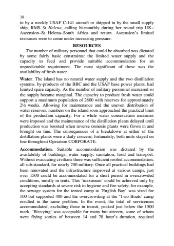 38in by a weekly USAF C-141 aircraft or shipped in by the small supplyship, RMS St Helena, calling bi-monthly during her round trip UK%u2013Ascension%u2013St Helena%u2013South Africa and return. Ascension%u2019s limitedresources were to come under increasing pressure.RESOURCESThe number of military personnel that could be absorbed was dictatedby some fairly basic constraints: the limited water supply and thecapacity to feed and provide suitable accommodation for anunpredictable requirement. The most significant of these was theavailability of fresh water.Water. The island has no natural water supply and the two distillationsystems, by-products of the BBC and the USAF base power plants, hadlimited spare capacity. As the number of military personnel increased sothe supply became marginal. The capacity to produce fresh water couldsupport a maximum population of 2800 with reserves for approximately2%u00bd weeks. Allowing for maintenance and the uneven distribution ofwater reserves, numbers on the island soon approached the practical limitof the production capacity. For a while water conservation measureswere imposed and the maintenance of the distillation plants delayed untilproduction was boosted when reverse osmosis plants were flown in andbrought on line. The consequences of a breakdown at either of thedistillation plants were a daily concern; fortunately, both units stayed online throughout Operation CORPORATE.Accommodation. Suitable accommodation was dictated by theavailability of buildings, water supply, sanitation, food and transport.Without evacuating civilians there was sufficient roofed accommodation,all sub-standard, for nearly 700 military. Once all practical buildings hadbeen renovated and the infrastructure improved at various camps, justover 1500 could be accommodated for a short period in overcrowdedconditions, mostly in tents. This %u2018maximum%u2019 could be achieved only byaccepting standards at severe risk to hygiene and fire safety; for example,the sewage system for the tented camp at %u2018English Bay%u2019 was sized for100 but supported 400 and the overcrowding at the %u2018Two Boats%u2019 campresulted in the same problem. In the event, the total of servicemenaccommodated, excluding those in transit, peaked just below the 1500mark. %u2018Bivvying%u2019 was acceptable for many but aircrew, some of whomwere flying sorties of between 14 and 28 hour%u2019s duration, required