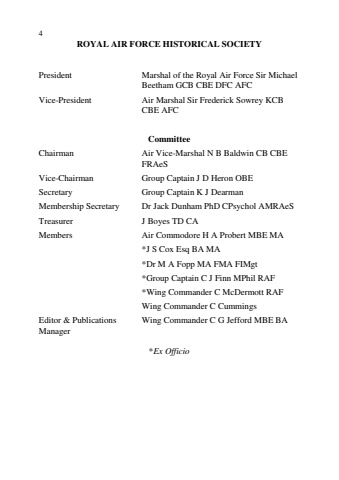 4ROYAL AIR FORCE HISTORICAL SOCIETYPresident Marshal of the Royal Air Force Sir MichaelBeetham GCB CBE DFC AFCVice-President Air Marshal Sir Frederick Sowrey KCBCBE AFCCommitteeChairman Air Vice-Marshal N B Baldwin CB CBEFRAeSVice-Chairman Group Captain J D Heron OBESecretary Group Captain K J DearmanMembership Secretary Dr Jack Dunham PhD CPsychol AMRAeSTreasurer J Boyes TD CAMembers Air Commodore H A Probert MBE MA*J S Cox Esq BA MA*Dr M A Fopp MA FMA FIMgt*Group Captain C J Finn MPhil RAF*Wing Commander C McDermott RAFWing Commander C CummingsEditor & Publications Wing Commander C G Jefford MBE BAManager*Ex Officio