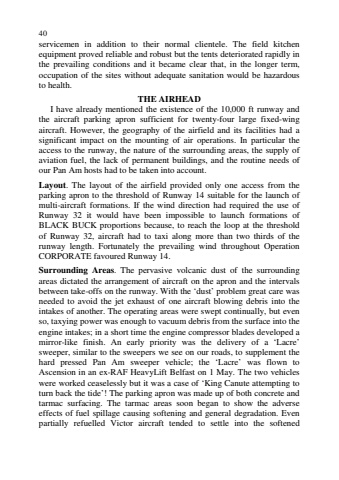 40servicemen in addition to their normal clientele. The field kitchenequipment proved reliable and robust but the tents deteriorated rapidly inthe prevailing conditions and it became clear that, in the longer term,occupation of the sites without adequate sanitation would be hazardousto health.THE AIRHEADI have already mentioned the existence of the 10,000 ft runway andthe aircraft parking apron sufficient for twenty-four large fixed-wingaircraft. However, the geography of the airfield and its facilities had asignificant impact on the mounting of air operations. In particular theaccess to the runway, the nature of the surrounding areas, the supply ofaviation fuel, the lack of permanent buildings, and the routine needs ofour Pan Am hosts had to be taken into account.Layout. The layout of the airfield provided only one access from theparking apron to the threshold of Runway 14 suitable for the launch ofmulti-aircraft formations. If the wind direction had required the use ofRunway 32 it would have been impossible to launch formations ofBLACK BUCK proportions because, to reach the loop at the thresholdof Runway 32, aircraft had to taxi along more than two thirds of therunway length. Fortunately the prevailing wind throughout OperationCORPORATE favoured Runway 14.Surrounding Areas. The pervasive volcanic dust of the surroundingareas dictated the arrangement of aircraft on the apron and the intervalsbetween take-offs on the runway. With the %u2018dust%u2019 problem great care wasneeded to avoid the jet exhaust of one aircraft blowing debris into theintakes of another. The operating areas were swept continually, but evenso, taxying power was enough to vacuum debris from the surface into theengine intakes; in a short time the engine compressor blades developed amirror-like finish. An early priority was the delivery of a %u2018Lacre%u2019sweeper, similar to the sweepers we see on our roads, to supplement thehard pressed Pan Am sweeper vehicle; the %u2018Lacre%u2019 was flown toAscension in an ex-RAF HeavyLift Belfast on 1 May. The two vehicleswere worked ceaselessly but it was a case of %u2018King Canute attempting toturn back the tide%u2019! The parking apron was made up of both concrete andtarmac surfacing. The tarmac areas soon began to show the adverseeffects of fuel spillage causing softening and general degradation. Evenpartially refuelled Victor aircraft tended to settle into the softened