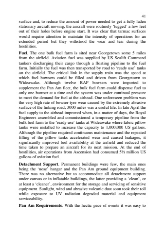 41surface and, to reduce the amount of power needed to get a fully ladenstationary aircraft moving, the aircraft were routinely %u2018tugged%u2019 a few feetout of their holes before engine start. It was clear that tarmac surfaceswould require attention to maintain the intensity of operations for anextended period but they withstood the wear and tear during thehostilities.Fuel. The one bulk fuel farm is sited near Georgetown some 5 milesfrom the airfield. Aviation fuel was supplied by US Sealift Commandtankers discharging their cargo through a floating pipeline to the fuelfarm. Initially the fuel was then transported by road to %u2018ready use%u2019 tankson the airfield. The critical link in the supply train was the speed atwhich fuel bowsers could be filled and driven from Georgetown toWideawake. Although twelve RAF bowsers were imported tosupplement the Pan Am fleet, the bulk fuel farm could dispense fuel toonly one bowser at a time and the system was under continual pressureto meet the demand for fuel at the airhead. One unforeseen problem wasthe very high rate of bowser tyre wear caused by the extremely abrasivesurface of the linking road; 3000 miles was a useful life. In late April thefuel supply to the airhead improved when, in a matter of days, the RoyalEngineers assembled and commissioned a temporary pipeline from thebulk fuel farm to the %u2018ready use%u2019 tanks at Wideawake where fabric pillowtanks were installed to increase the capacity to 1,000,000 US gallons.Although the pipeline required continuous maintenance and the repeatedfilling of the pillow tanks accelerated wear and caused leakages, itsignificantly improved fuel availability at the airfield and reduced thetime taken to prepare an aircraft for its next mission. At the end ofhostilities, air operations from Ascension had consumed 5%u00bd million USgallons of aviation fuel.Detachment Support. Permanent buildings were few, the main onesbeing the %u2018nose%u2019 hangar and the Pan Am ground equipment building.There was no alternative but to accommodate all detachment supportunder canvas or in inflatable buildings, the latter providing a %u2018clean%u2019, orat least a %u2018cleaner%u2019, environment for the storage and servicing of sensitiveequipment. Sunlight, wind and abrasive volcanic dust soon took their tollwhile exposure to UV radiation degraded material and equipmentserviceability.Pan Am Requirements. With the hectic pace of events it was easy to