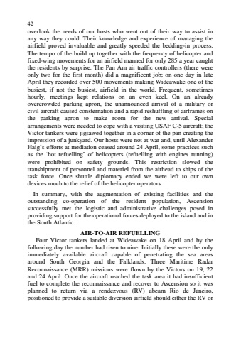 42overlook the needs of our hosts who went out of their way to assist inany way they could. Their knowledge and experience of managing theairfield proved invaluable and greatly speeded the bedding-in process.The tempo of the build up together with the frequency of helicopter andfixed-wing movements for an airfield manned for only 285 a year caughtthe residents by surprise. The Pan Am air traffic controllers (there wereonly two for the first month) did a magnificent job; on one day in lateApril they recorded over 500 movements making Wideawake one of thebusiest, if not the busiest, airfield in the world. Frequent, sometimeshourly, meetings kept relations on an even keel. On an alreadyovercrowded parking apron, the unannounced arrival of a military orcivil aircraft caused consternation and a rapid reshuffling of airframes onthe parking apron to make room for the new arrival. Specialarrangements were needed to cope with a visiting USAF C-5 aircraft; theVictor tankers were jigsawed together in a corner of the pan creating theimpression of a junkyard. Our hosts were not at war and, until AlexanderHaig%u2019s efforts at mediation ceased around 24 April, some practices suchas the %u2018hot refuelling%u2019 of helicopters (refuelling with engines running)were prohibited on safety grounds. This restriction slowed thetranshipment of personnel and materiel from the airhead to ships of thetask force. Once shuttle diplomacy ended we were left to our owndevices much to the relief of the helicopter operators.In summary, with the augmentation of existing facilities and theoutstanding co-operation of the resident population, Ascensionsuccessfully met the logistic and administrative challenges posed inproviding support for the operational forces deployed to the island and inthe South Atlantic.AIR-TO-AIR REFUELLINGFour Victor tankers landed at Wideawake on 18 April and by thefollowing day the number had risen to nine. Initially these were the onlyimmediately available aircraft capable of penetrating the sea areasaround South Georgia and the Falklands. Three Maritime RadarReconnaissance (MRR) missions were flown by the Victors on 19, 22and 24 April. Once the aircraft reached the task area it had insufficientfuel to complete the reconnaissance and recover to Ascension so it wasplanned to return via a rendezvous (RV) abeam Rio de Janeiro,positioned to provide a suitable diversion airfield should either the RV or