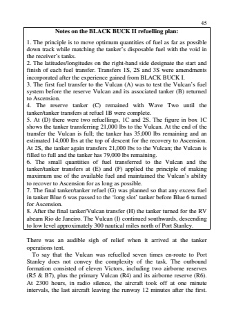 45Notes on the BLACK BUCK II refuelling plan:1. The principle is to move optimum quantities of fuel as far as possibledown track while matching the tanker%u2019s disposable fuel with the void inthe receiver%u2019s tanks.2. The latitudes/longitudes on the right-hand side designate the start andfinish of each fuel transfer. Transfers 1S, 2S and 3S were amendmentsincorporated after the experience gained from BLACK BUCK I.3. The first fuel transfer to the Vulcan (A) was to test the Vulcan%u2019s fuelsystem before the reserve Vulcan and its associated tanker (B) returnedto Ascension.4. The reserve tanker (C) remained with Wave Two until thetanker/tanker transfers at refuel 1B were complete.5. At (D) there were two refuellings, 1C and 2S. The figure in box 1Cshows the tanker transferring 21,000 lbs to the Vulcan. At the end of thetransfer the Vulcan is full; the tanker has 35,000 lbs remaining and anestimated 14,000 lbs at the top of descent for the recovery to Ascension.At 2S, the tanker again transfers 21,000 lbs to the Vulcan; the Vulcan isfilled to full and the tanker has 79,000 lbs remaining.6. The small quantities of fuel transferred to the Vulcan and thetanker/tanker transfers at (E) and (F) applied the principle of makingmaximum use of the available fuel and maintained the Vulcan%u2019s abilityto recover to Ascension for as long as possible.7. The final tanker/tanker refuel (G) was planned so that any excess fuelin tanker Blue 6 was passed to the %u2018long slot%u2019 tanker before Blue 6 turnedfor Ascension.8. After the final tanker/Vulcan transfer (H) the tanker turned for the RVabeam Rio de Janeiro. The Vulcan (I) continued southwards, descendingto low level approximately 300 nautical miles north of Port Stanley.There was an audible sigh of relief when it arrived at the tankeroperations tent.To say that the Vulcan was refuelled seven times en-route to PortStanley does not convey the complexity of the task. The outboundformation consisted of eleven Victors, including two airborne reserves(R5 & B7), plus the primary Vulcan (R4) and its airborne reserve (R6).At 2300 hours, in radio silence, the aircraft took off at one minuteintervals, the last aircraft leaving the runway 12 minutes after the first.