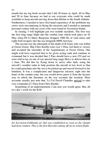 52month but my log book reveals that I did 20 hours in April, 40 in Mayand 50 in June because we had to use everyone who could be madeavailable to keep aircraft moving down that lifeline to the South Atlantic.Furthermore, I needed to have first hand experience of the problems mycrews were encountering in flying the missions and I needed to maintainpersonal contact with my crews who were based in Ascension Island.In closing, I will highlight just two notable incidents. The first wasthe first long range flight into the combat zone which took place on 16May when Flt Lt Harry Burgoyne dropped 1000 lbs of vital stores andeight SAS troopers into the sea alongside HMS Antelope.The second was the aftermath of the death of H Jones who was killedat Goose Green. Maj Chris Keeble took over 2 Para, led them to victoryand accepted the surrender of the Argentineans at Goose Green. Onemight well have expected him to be given acting rank and continue incommand but it was decided that 2 Para should have a new CO and wewere told to lay on one of our special long range Hercs to deliver him on1 June. We did this by flying down to arrive after dark, using theaircraft%u2019s weather radar to help position the aircraft at low level so thathe could parachute into the sea to be picked up and moved forward to hisbattalion. It was a complicated and dangerous mission, right into theheart of the combat zone, but you would never guess it from the laconicway in which the literature on the war recounts the incident. Mostaccounts usually just note that %u2018Lt Col David Chandler arrived to takeover command of 2 Para from Chris Keeble.%u2019Something of an understatement, I am sure you would agree. But, allin a day%u2019s work for the RAF.An Ascension-Falklands air link was established as soon as the islandshad been retaken. This is the first Hercules taking off on its return flight.