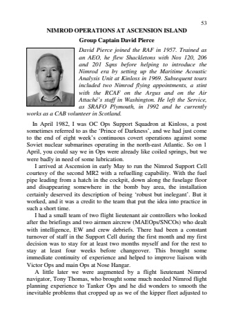 53NIMROD OPERATIONS AT ASCENSION ISLANDGroup Captain David PierceDavid Pierce joined the RAF in 1957. Trained asan AEO, he flew Shackletons with Nos 120, 206and 201 Sqns before helping to introduce theNimrod era by setting up the Maritime AcousticAnalysis Unit at Kinloss in 1969. Subsequent toursincluded two Nimrod flying appointments, a stintwith the RCAF on the Argus and on the AirAttach%u00e9%u2019s staff in Washington. He left the Service,as SRAFO Plymouth, in 1992 and he currentlyworks as a CAB volunteer in Scotland.In April 1982, I was OC Ops Support Squadron at Kinloss, a postsometimes referred to as the %u2018Prince of Darkness%u2019, and we had just cometo the end of eight week%u2019s continuous covert operations against someSoviet nuclear submarines operating in the north-east Atlantic. So on 1April, you could say we in Ops were already like coiled springs, but wewere badly in need of some lubrication.I arrived at Ascension in early May to run the Nimrod Support Cellcourtesy of the second MR2 with a refuelling capability. With the fuelpipe leading from a hatch in the cockpit, down along the fuselage floorand disappearing somewhere in the bomb bay area, the installationcertainly deserved its description of being %u2018robust but inelegant%u2019. But itworked, and it was a credit to the team that put the idea into practice insuch a short time.I had a small team of two flight lieutenant air controllers who lookedafter the briefings and two airmen aircrew (MAEOps/SNCOs) who dealtwith intelligence, EW and crew debriefs. There had been a constantturnover of staff in the Support Cell during the first month and my firstdecision was to stay for at least two months myself and for the rest tostay at least four weeks before changeover. This brought someimmediate continuity of experience and helped to improve liaison withVictor Ops and main Ops at Nose Hangar.A little later we were augmented by a flight lieutenant Nimrodnavigator, Tony Thomas, who brought some much needed Nimrod flightplanning experience to Tanker Ops and he did wonders to smooth theinevitable problems that cropped up as we of the kipper fleet adjusted to