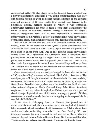 57each contact in the 100 plus which might be detected during a patrol wasa powerful capability, especially if you could report that there was onlyone possible hostile, or even no hostile vessels, amongst all the contactsdetected during a 15-18 hour flight. If a contact was deemed to bepotentially hostile, perhaps because of where it was operating,Searchwater permitted the crew to make a good stab at classifying thereturn as naval or non-naval without having to penetrate the target%u2019smissile engagement zone. All of this represented a considerableimprovement in the Nimrod%u2019s ability to conduct long range surveillanceover a large areas, even when it produced only negative intelligence.Not so well known was the fact that infra-red linescan was triedbriefly, fitted in the starboard beam. Quite a good performance wasachieved in trials held at Kinloss during April and the equipment wastried once in anger from ASI. One of the daytime island surveillancesorties found an Argentinean bulk freighter with a projected trackpassing close to ASI during the night hours. One of our chief techsperformed wonders fitting the equipment (there was only one set) inshort order for a night sortie to check that the vessel kept well away fromASI. Sadly I have to report that the infra-red did not perform well on thatsortie and it was never tried out again.Crew accommodation at Ascension changed in June with the arrivalof %u2018Concertina City%u2019, courtesy of several USAF C-141 Starlifters. Thenaval party at ASI thought a nautical touch would raise the tone and theychristened the cabins with such august names as Jellicoe, Fisher andHornblower. Needless to say, they were thwarted by our bold aircrewswho preferred Pugwash, Bird%u2019s Eye and Long John Silver. Americanengineers erected the cabins in typically efficient style but when queriedabout sewage disposal at one of the main briefings a grizzled Seabeecommented somewhat curtly that he was not going to be responsible forany British %u2018S-H-One-T%u2019.It had been a challenging time; the Nimrod had gained severalimprovements, especially to its weapons suite, and we had all learned alot, particularly about ourselves. I left Ascension on 4 July, about threeweeks after the white flag was raised over Port Stanley. We sawCanberra passing through, covered in rust and full of Royal Marines,some of the real heroes. Station Routine Order No 1 came out that day.Things would never have been the same; it was a good time to leave.