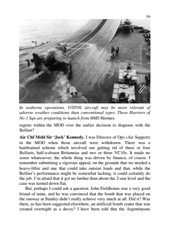 59In seaborne operations, V/STOL aircraft may be more tolerant ofadverse weather conditions than conventional types. These Harriers ofNo 1 Sqn are preparing to launch from HMS Hermes.regrets within the MOD over the earlier decision to dispense with theBelfast?Air Chf Mshl Sir %u2018Jock%u2019 Kennedy. I was Director of Ops (Air Support)in the MOD when those aircraft were withdrawn. There was ahairbrained scheme which involved our getting rid of three or fourBelfasts, half-a-dozen Britannias and two or three VC10s. It made nosense whatsoever; the whole thing was driven by finance, of course. Iremember submitting a vigorous appeal, on the grounds that we needed aheavy-lifter and one that could take outsize loads and that, while theBelfast%u2019s performance might be somewhat lacking, it could certainly dothe job. I%u2019m afraid that it got no further than about the 2-star level and thecase was turned down flat.But, perhaps I could ask a question. John Fieldhouse was a very goodfriend of mine, and he was convinced that the bomb that was placed onthe runway at Stanley didn%u2019t really achieve very much at all. Did it? Wasthere, as has been suggested elsewhere, an artificial bomb crater that wascreated overnight as a decoy? I have been told that the Argentineans