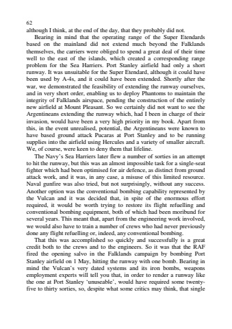 62although I think, at the end of the day, that they probably did not.Bearing in mind that the operating range of the Super Etendardsbased on the mainland did not extend much beyond the Falklandsthemselves, the carriers were obliged to spend a great deal of their timewell to the east of the islands, which created a corresponding rangeproblem for the Sea Harriers. Port Stanley airfield had only a shortrunway. It was unsuitable for the Super Etendard, although it could havebeen used by A-4s, and it could have been extended. Shortly after thewar, we demonstrated the feasibility of extending the runway ourselves,and in very short order, enabling us to deploy Phantoms to maintain theintegrity of Falklands airspace, pending the construction of the entirelynew airfield at Mount Pleasant. So we certainly did not want to see theArgentineans extending the runway which, had I been in charge of theirinvasion, would have been a very high priority in my book. Apart fromthis, in the event unrealised, potential, the Argentineans were known tohave based ground attack Pucaras at Port Stanley and to be runningsupplies into the airfield using Hercules and a variety of smaller aircraft.We, of course, were keen to deny them that lifeline.The Navy%u2019s Sea Harriers later flew a number of sorties in an attemptto hit the runway, but this was an almost impossible task for a single-seatfighter which had been optimised for air defence, as distinct from groundattack work, and it was, in any case, a misuse of this limited resource.Naval gunfire was also tried, but not surprisingly, without any success.Another option was the conventional bombing capability represented bythe Vulcan and it was decided that, in spite of the enormous effortrequired, it would be worth trying to restore its flight refuelling andconventional bombing equipment, both of which had been moribund forseveral years. This meant that, apart from the engineering work involved,we would also have to train a number of crews who had never previouslydone any flight refuelling or, indeed, any conventional bombing.That this was accomplished so quickly and successfully is a greatcredit both to the crews and to the engineers. So it was that the RAFfired the opening salvo in the Falklands campaign by bombing PortStanley airfield on 1 May, hitting the runway with one bomb. Bearing inmind the Vulcan%u2019s very dated systems and its iron bombs, weaponsemployment experts will tell you that, in order to render a runway likethe one at Port Stanley %u2018unuseable%u2019, would have required some twentyfive to thirty sorties, so, despite what some critics may think, that single