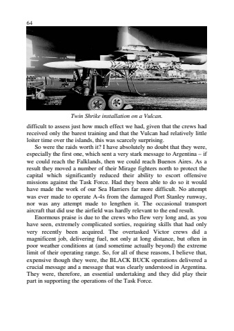 64Twin Shrike installation on a Vulcan.difficult to assess just how much effect we had, given that the crews hadreceived only the barest training and that the Vulcan had relatively littleloiter time over the islands, this was scarcely surprising.So were the raids worth it? I have absolutely no doubt that they were,especially the first one, which sent a very stark message to Argentina %u2013 ifwe could reach the Falklands, then we could reach Buenos Aires. As aresult they moved a number of their Mirage fighters north to protect thecapital which significantly reduced their ability to escort offensivemissions against the Task Force. Had they been able to do so it wouldhave made the work of our Sea Harriers far more difficult. No attemptwas ever made to operate A-4s from the damaged Port Stanley runway,nor was any attempt made to lengthen it. The occasional transportaircraft that did use the airfield was hardly relevant to the end result.Enormous praise is due to the crews who flew very long and, as youhave seen, extremely complicated sorties, requiring skills that had onlyvery recently been acquired. The overtasked Victor crews did amagnificent job, delivering fuel, not only at long distance, but often inpoor weather conditions at (and sometime actually beyond) the extremelimit of their operating range. So, for all of these reasons, I believe that,expensive though they were, the BLACK BUCK operations delivered acrucial message and a message that was clearly understood in Argentina.They were, therefore, an essential undertaking and they did play theirpart in supporting the operations of the Task Force.