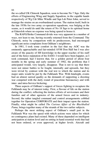 66the so-called UK Chinook Squadron, soon to become No 7 Sqn. Only theefforts of Engineering Wing and Supply Squadron, in the capable handsrespectively of Wg Cdr Mike Windle and Sqn Ldr Peter John, served tomanage the strains on an overburdened system. The station itself, built inthe late 1930s for two army co-operation squadrons, was bulging at theseams, as it would do until the return of No 18 Sqn to its spiritual homeat G%u00fctersloh where no expense was being spared to house it.The RAFG/Strike Command divide was very apparent in a number ofways, not least to me, having recently returned from the Command. TheChinook, noisy by comparison with its predecessors, had encouragedsignificant noise complaints from Odiham%u2019s neighbours.In 1981, I took some comfort in the fact that my AOC was theeminently approachable and fair-minded AVM Don Hall but I was alsoaware of the paucity of SH knowledge in the upper reaches of his staffand of the fierce reputation of his SASO. I would have been happier, as Itook command, had I known that, for a golden period of about fourmonths in the spring and early summer of 1982, the problems that Ianticipated would, very largely, disappear. That is not to say that therewere not minor battles to be fought, internally and upwards, but theywere trivial by contrast with the real test to which the station and itsmajor units would be put by the Falklands War. With hindsight, eventshad an almost surreal quality as the demands of supporting a shootingwar competed with the daily round of peacetime bureaucracy and withinter- and intra-Service bickering.Three aspects of Odiham%u2019s support of forces fighting to recapture theFalklands may be of interest today. First, a flavour of life on the stationduring the conflict, reflecting the tireless efforts of servicemen and theirfamilies and of other agencies of the armed forces and in industry.Second, the rather tangled command and control arrangements cobbledtogether for Operation CORPORATE and their impact upon the station.Finally, what might be called The Curious Affair of the BlackballedPuma, brings together many of the strands of the two earlier subjects.Perhaps the most striking aspect of Odiham%u2019s small part in theFalklands War was the speed with which actions were taken for whichno contingency plans had existed. Many of these depended on intelligentanticipation at station level and on setting in hand essential work that hadnot been ordered, or even approved, at higher levels. Aircraft and