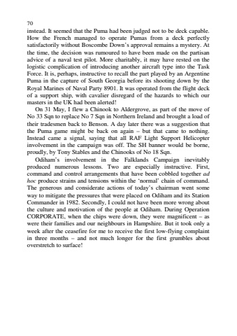 70instead. It seemed that the Puma had been judged not to be deck capable.How the French managed to operate Pumas from a deck perfectlysatisfactorily without Boscombe Down%u2019s approval remains a mystery. Atthe time, the decision was rumoured to have been made on the partisanadvice of a naval test pilot. More charitably, it may have rested on thelogistic complication of introducing another aircraft type into the TaskForce. It is, perhaps, instructive to recall the part played by an ArgentinePuma in the capture of South Georgia before its shooting down by theRoyal Marines of Naval Party 8901. It was operated from the flight deckof a support ship, with cavalier disregard of the hazards to which ourmasters in the UK had been alerted!On 31 May, I flew a Chinook to Aldergrove, as part of the move ofNo 33 Sqn to replace No 7 Sqn in Northern Ireland and brought a load oftheir tradesmen back to Benson. A day later there was a suggestion thatthe Puma game might be back on again %u2013 but that came to nothing.Instead came a signal, saying that all RAF Light Support Helicopterinvolvement in the campaign was off. The SH banner would be borne,proudly, by Tony Stables and the Chinooks of No 18 Sqn.Odiham%u2019s involvement in the Falklands Campaign inevitablyproduced numerous lessons. Two are especially instructive. First,command and control arrangements that have been cobbled together adhoc produce strains and tensions within the %u2018normal%u2019 chain of command.The generous and considerate actions of today%u2019s chairman went someway to mitigate the pressures that were placed on Odiham and its StationCommander in 1982. Secondly, I could not have been more wrong aboutthe culture and motivation of the people at Odiham. During OperationCORPORATE, when the chips were down, they were magnificent %u2013 aswere their families and our neighbours in Hampshire. But it took only aweek after the ceasefire for me to receive the first low-flying complaintin three months %u2013 and not much longer for the first grumbles aboutoverstretch to surface!
