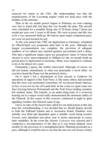 72removed for return to the USA. My understanding was that themanufacturers of the Lycoming engine could not keep pace with thebuilders of the airframe.Thus in the six month period August to February we were runningvery fast to stand still, but then this was broadly the plan. The aircraftwere scheduled for a monthly flying rate of 30 hours rising 2 hours permonth per year over 5 years to 40 hours. We were at peace and this wasto be a very measured build up. We had no spare major component parts,nor were we provisioned for any.As the year turned into 1982 our deployment to Germany, scheduledfor March/April was postponed until later in the year. Although ourhangar accommodation was complete, the provision of adequatenumbers of (or indeed any) married quarters necessitated such a delay.This had a significant impact upon my groundcrew many of whom hadelected to serve unaccompanied at Odiham for the six-month build upperiod prior to deployment to Germany. Many were required to continueto do so for almost two years.Fortunately, I guess, the conflict intervened. Although, of course, wedid not feature immediately in what was principally a naval affair. Asyou have heard the Puma was the preferred choice.On 6 April I led a detachment of four aircraft to Culdrose foroperations in support of the Task Force. I, like many others, had assumedthat this force was positioned somewhere off Ascension Island whereas,in fact, it was not too far off Lands End. In the event we spent some twodays ferrying between Portsmouth and the Task Force loading essential,but omitted, items. The transfer, as an under-slung load, of a seven-tonbearing out to a major vessel really demonstrated the enormous utility ofthe Chinook. In the course of this exercise, conducted at night in quiteappalling weather, the Chinook came of age.I have no idea of the factors that called for our deployment at this latehour but, notwithstanding, it was decided that we should deploy aircraftto both the Falkland Islands and to Ascension Island. Numbers wereinitially very fluid and dependent upon a suitable vessel being located.Vessels were identified and pilots sent to docks nationwide to assesstheir suitability. In the event the Atlantic Conveyor was selected and Iconducted a reconnaissance of the ship as it was being adapted, mostnotably by the provision of a strengthened deck. Planning proceeded at apace, although it would be true to say that the aim was not always clearly
