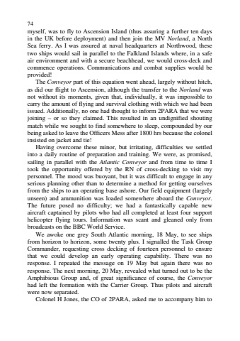 74myself, was to fly to Ascension Island (thus assuring a further ten daysin the UK before deployment) and then join the MV Norland, a NorthSea ferry. As I was assured at naval headquarters at Northwood, thesetwo ships would sail in parallel to the Falkland Islands where, in a safeair environment and with a secure beachhead, we would cross-deck andcommence operations. Communications and combat supplies would beprovided!The Conveyor part of this equation went ahead, largely without hitch,as did our flight to Ascension, although the transfer to the Norland wasnot without its moments, given that, individually, it was impossible tocarry the amount of flying and survival clothing with which we had beenissued. Additionally, no one had thought to inform 2PARA that we werejoining %u2013 or so they claimed. This resulted in an undignified shoutingmatch while we sought to find somewhere to sleep, compounded by ourbeing asked to leave the Officers Mess after 1800 hrs because the colonelinsisted on jacket and tie!Having overcome these minor, but irritating, difficulties we settledinto a daily routine of preparation and training. We were, as promised,sailing in parallel with the Atlantic Conveyor and from time to time Itook the opportunity offered by the RN of cross-decking to visit mypersonnel. The mood was buoyant, but it was difficult to engage in anyserious planning other than to determine a method for getting ourselvesfrom the ships to an operating base ashore. Our field equipment (largelyunseen) and ammunition was loaded somewhere aboard the Conveyor.The future posed no difficulty; we had a fantastically capable newaircraft captained by pilots who had all completed at least four supporthelicopter flying tours. Information was scant and gleaned only frombroadcasts on the BBC World Service.We awoke one grey South Atlantic morning, 18 May, to see shipsfrom horizon to horizon, some twenty plus. I signalled the Task GroupCommander, requesting cross decking of fourteen personnel to ensurethat we could develop an early operating capability. There was noresponse. I repeated the message on 19 May but again there was noresponse. The next morning, 20 May, revealed what turned out to be theAmphibious Group and, of great significance of course, the Conveyorhad left the formation with the Carrier Group. Thus pilots and aircraftwere now separated.Colonel H Jones, the CO of 2PARA, asked me to accompany him to