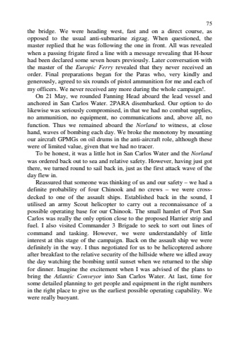 75the bridge. We were heading west, fast and on a direct course, asopposed to the usual anti-submarine zigzag. When questioned, themaster replied that he was following the one in front. All was revealedwhen a passing frigate fired a line with a message revealing that H-hourhad been declared some seven hours previously. Later conversation withthe master of the Europic Ferry revealed that they never received anorder. Final preparations began for the Paras who, very kindly andgenerously, agreed to six rounds of pistol ammunition for me and each ofmy officers. We never received any more during the whole campaign!.On 21 May, we rounded Fanning Head aboard the lead vessel andanchored in San Carlos Water. 2PARA disembarked. Our option to dolikewise was seriously compromised, in that we had no combat supplies,no ammunition, no equipment, no communications and, above all, nofunction. Thus we remained aboard the Norland to witness, at closehand, waves of bombing each day. We broke the monotony by mountingour aircraft GPMGs on oil drums in the anti-aircraft role, although thesewere of limited value, given that we had no tracer.To be honest, it was a little hot in San Carlos Water and the Norlandwas ordered back out to sea and relative safety. However, having just gotthere, we turned round to sail back in, just as the first attack wave of theday flew in.Reassured that someone was thinking of us and our safety %u2013 we had adefinite probability of four Chinook and no crews %u2013 we were crossdecked to one of the assault ships. Established back in the sound, Iutilised an army Scout helicopter to carry out a reconnaissance of apossible operating base for our Chinook. The small hamlet of Port SanCarlos was really the only option close to the proposed Harrier strip andfuel. I also visited Commander 3 Brigade to seek to sort out lines ofcommand and tasking. However, we were understandably of littleinterest at this stage of the campaign. Back on the assault ship we weredefinitely in the way. I thus negotiated for us to be helicoptered ashoreafter breakfast to the relative security of the hillside where we idled awaythe day watching the bombing until sunset when we returned to the shipfor dinner. Imagine the excitement when I was advised of the plans tobring the Atlantic Conveyor into San Carlos Water. At last, time forsome detailed planning to get people and equipment in the right numbersin the right place to give us the earliest possible operating capability. Wewere really buoyant.