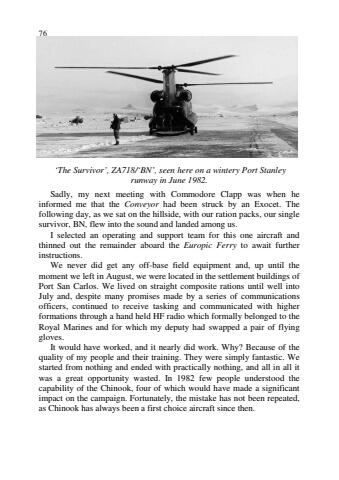 76 %u2018The Survivor%u2019, ZA718/%u2018BN%u2019, seen here on a wintery Port Stanleyrunway in June 1982.Sadly, my next meeting with Commodore Clapp was when heinformed me that the Conveyor had been struck by an Exocet. Thefollowing day, as we sat on the hillside, with our ration packs, our singlesurvivor, BN, flew into the sound and landed among us.I selected an operating and support team for this one aircraft andthinned out the remainder aboard the Europic Ferry to await furtherinstructions.We never did get any off-base field equipment and, up until themoment we left in August, we were located in the settlement buildings ofPort San Carlos. We lived on straight composite rations until well intoJuly and, despite many promises made by a series of communicationsofficers, continued to receive tasking and communicated with higherformations through a hand held HF radio which formally belonged to theRoyal Marines and for which my deputy had swapped a pair of flyinggloves.It would have worked, and it nearly did work. Why? Because of thequality of my people and their training. They were simply fantastic. Westarted from nothing and ended with practically nothing, and all in all itwas a great opportunity wasted. In 1982 few people understood thecapability of the Chinook, four of which would have made a significantimpact on the campaign. Fortunately, the mistake has not been repeated,as Chinook has always been a first choice aircraft since then.