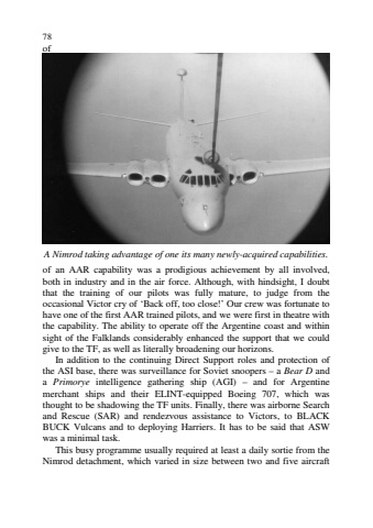 78ofA Nimrod taking advantage of one its many newly-acquired capabilities.of an AAR capability was a prodigious achievement by all involved,both in industry and in the air force. Although, with hindsight, I doubtthat the training of our pilots was fully mature, to judge from theoccasional Victor cry of %u2018Back off, too close!%u2019 Our crew was fortunate tohave one of the first AAR trained pilots, and we were first in theatre withthe capability. The ability to operate off the Argentine coast and withinsight of the Falklands considerably enhanced the support that we couldgive to the TF, as well as literally broadening our horizons.In addition to the continuing Direct Support roles and protection ofthe ASI base, there was surveillance for Soviet snoopers %u2013 a Bear D anda Primorye intelligence gathering ship (AGI) %u2013 and for Argentinemerchant ships and their ELINT-equipped Boeing 707, which wasthought to be shadowing the TF units. Finally, there was airborne Searchand Rescue (SAR) and rendezvous assistance to Victors, to BLACKBUCK Vulcans and to deploying Harriers. It has to be said that ASWwas a minimal task.This busy programme usually required at least a daily sortie from theNimrod detachment, which varied in size between two and five aircraft